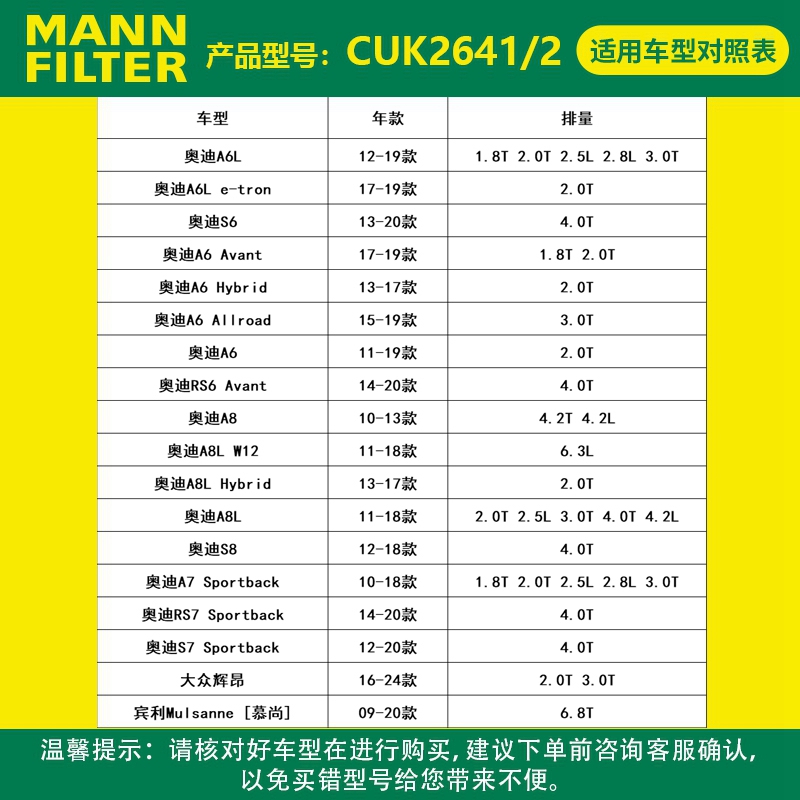 2空调滤芯适用奥迪A6L RS6 S8大众辉昂 曼牌CUK2641