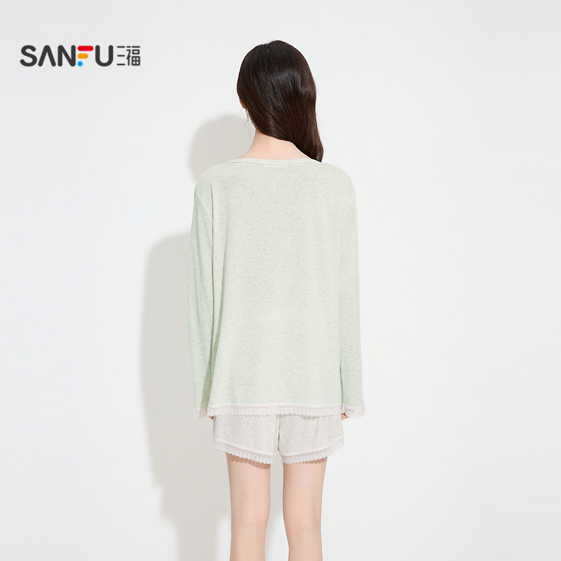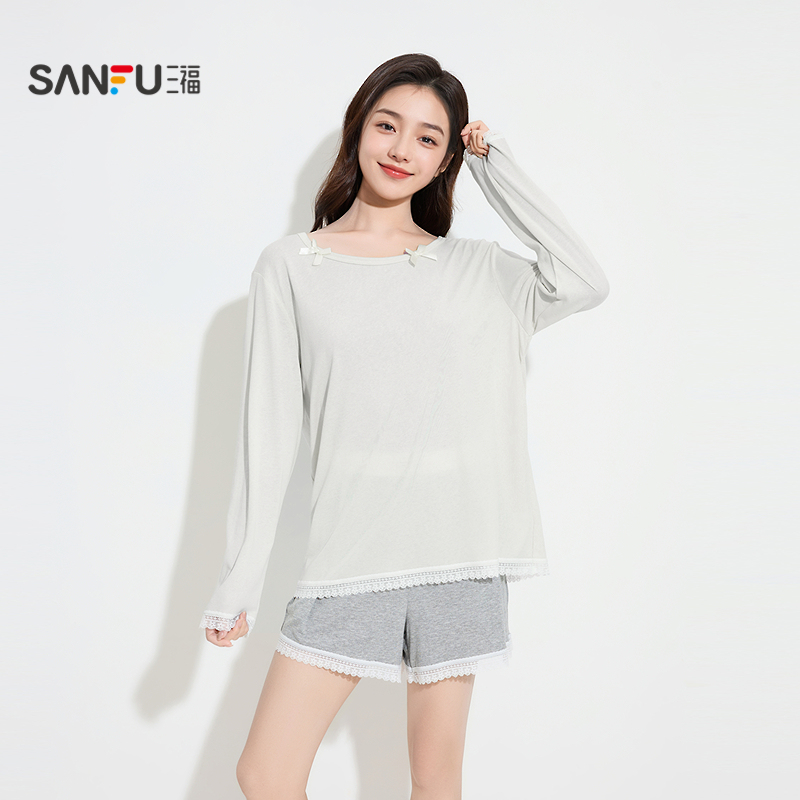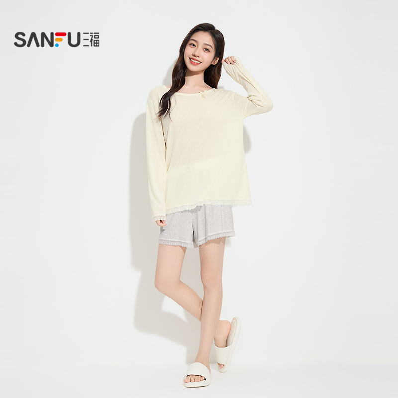 套装 三福睡衣女2025秋季 短裤 长袖 简约甜美宽松家居服女503592 新款
