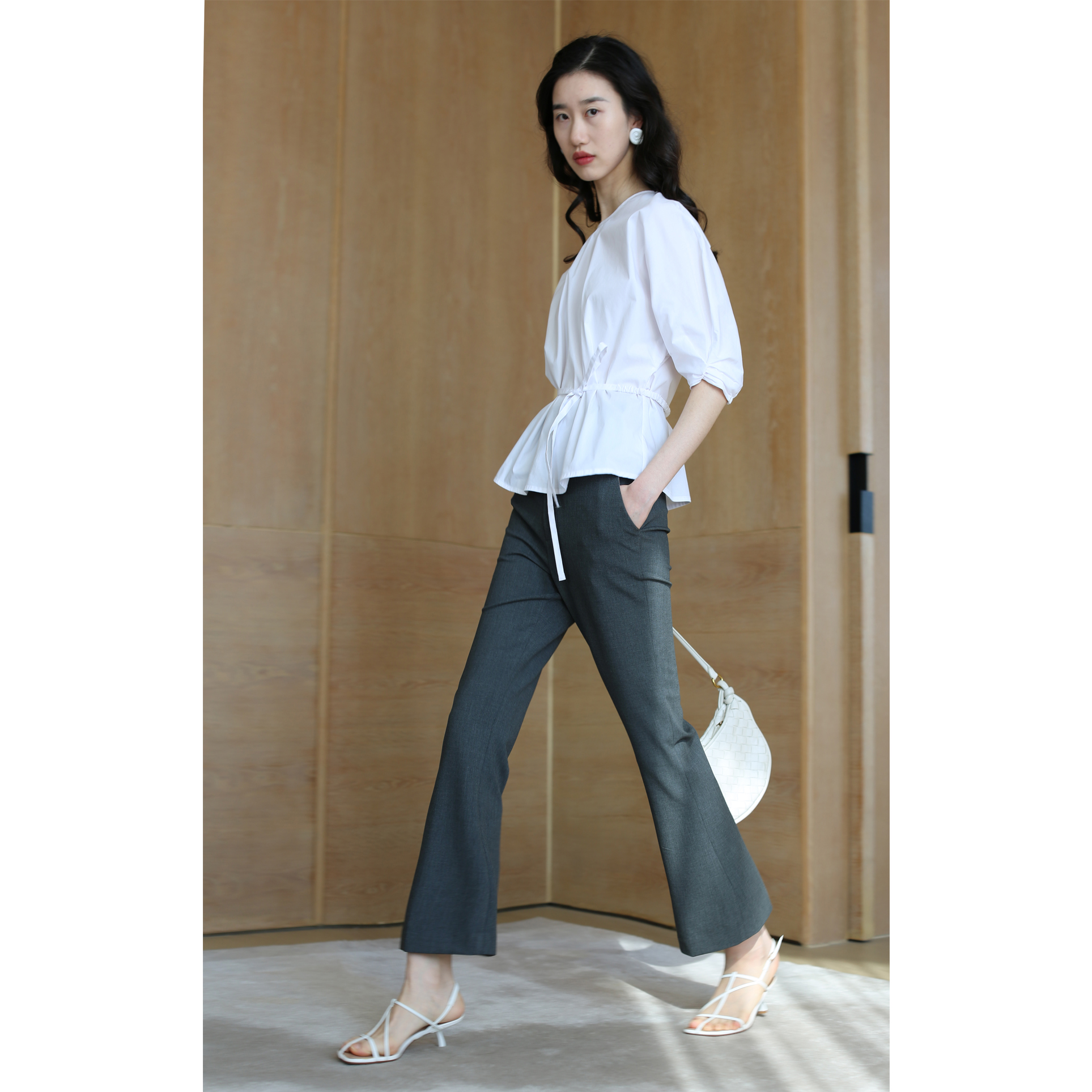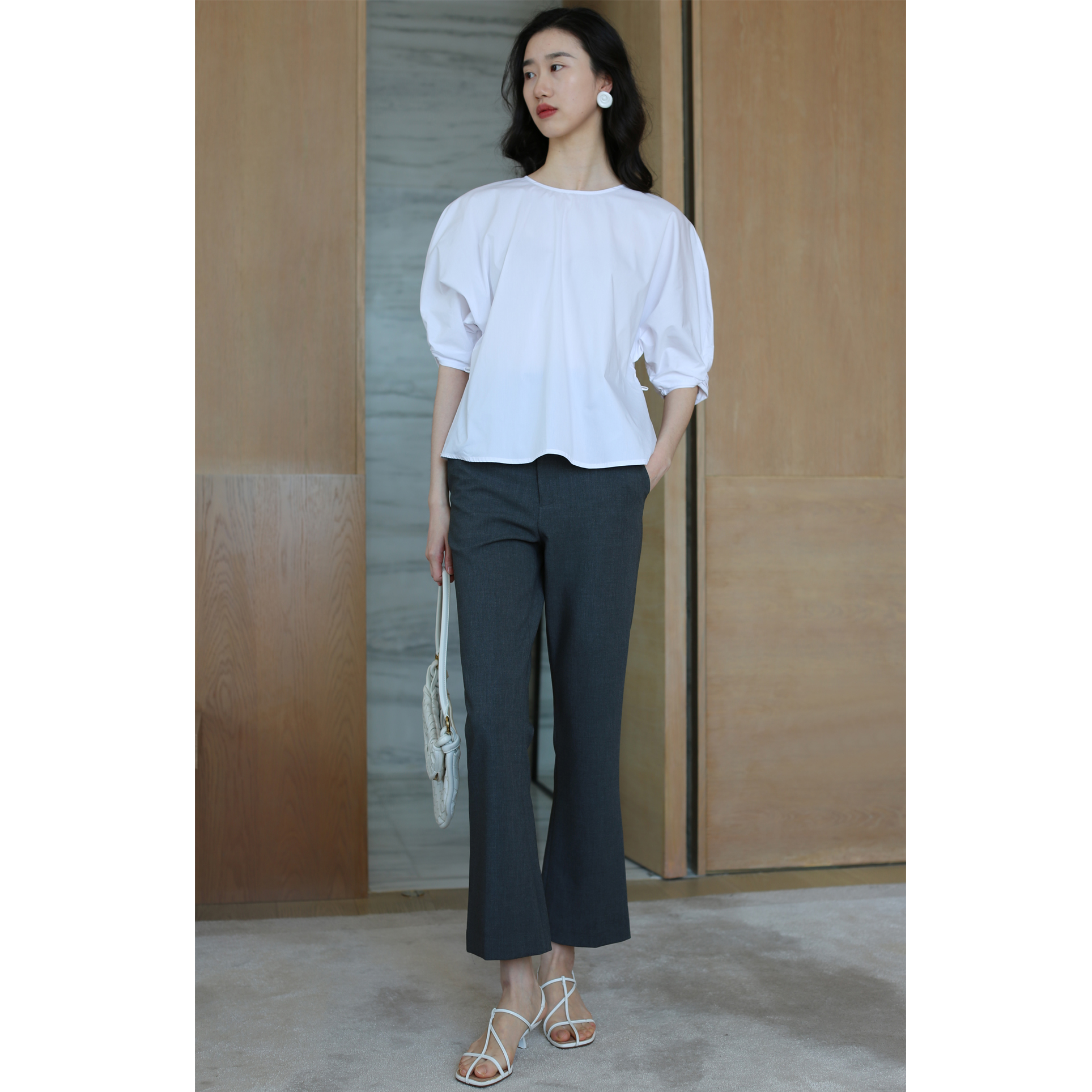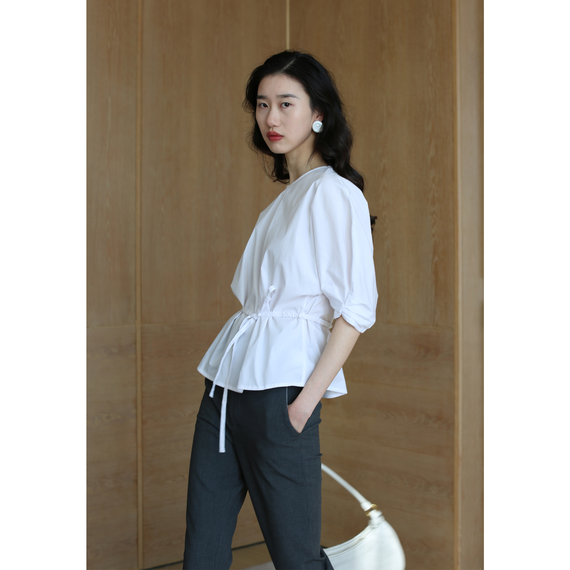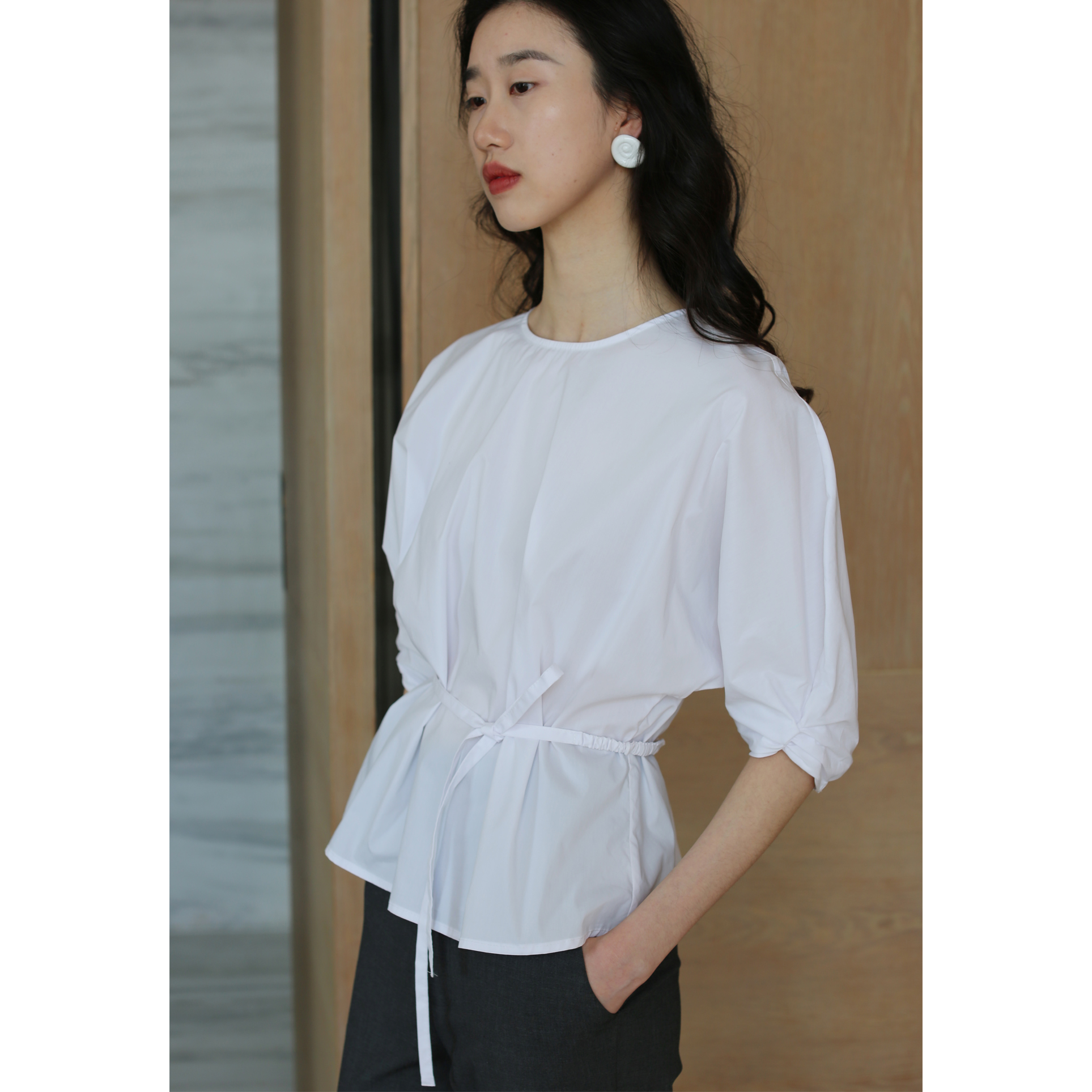 无有无印白色棉质抗皱五分袖 25013 圆领腰带收腰衬衫