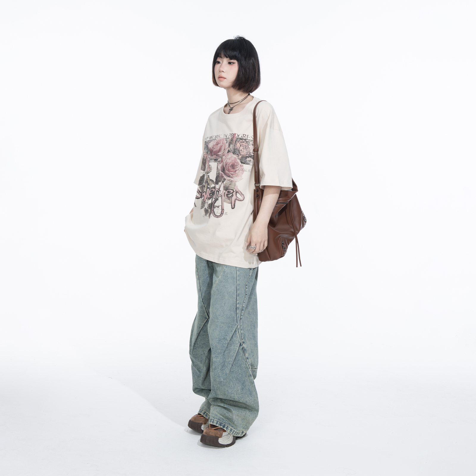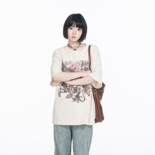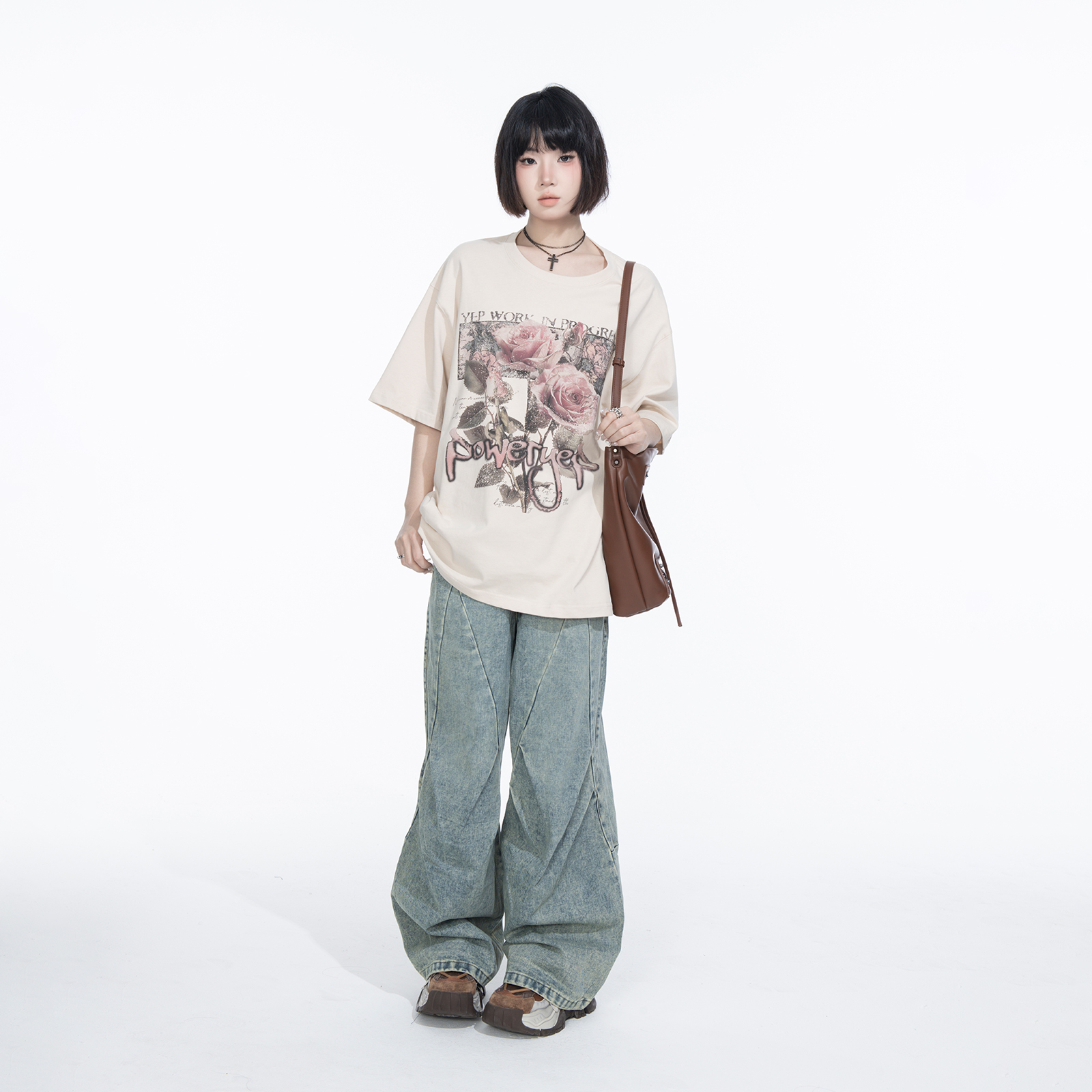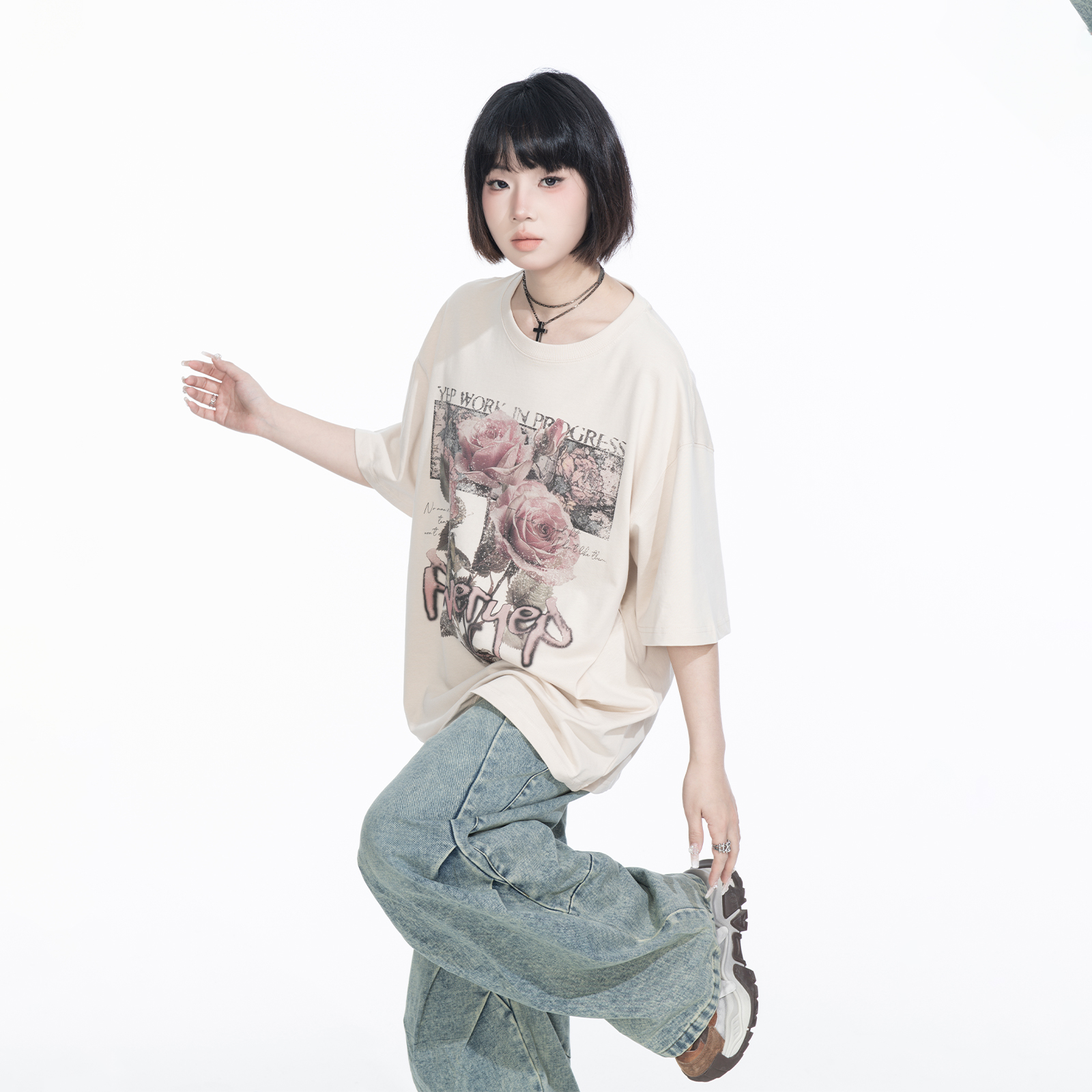 半袖 YEP复古玫瑰花短袖 圆领情侣装 新款 宽松潮牌上衣 t恤男女春夏季