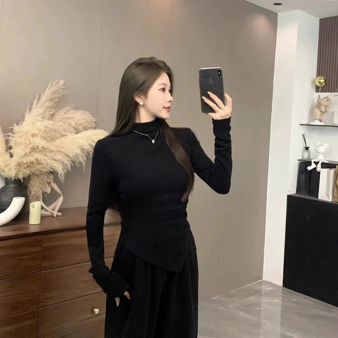 纯色不规则两件套下摆半高领T恤高腰百搭加绒拖地休闲长裤 女 套装