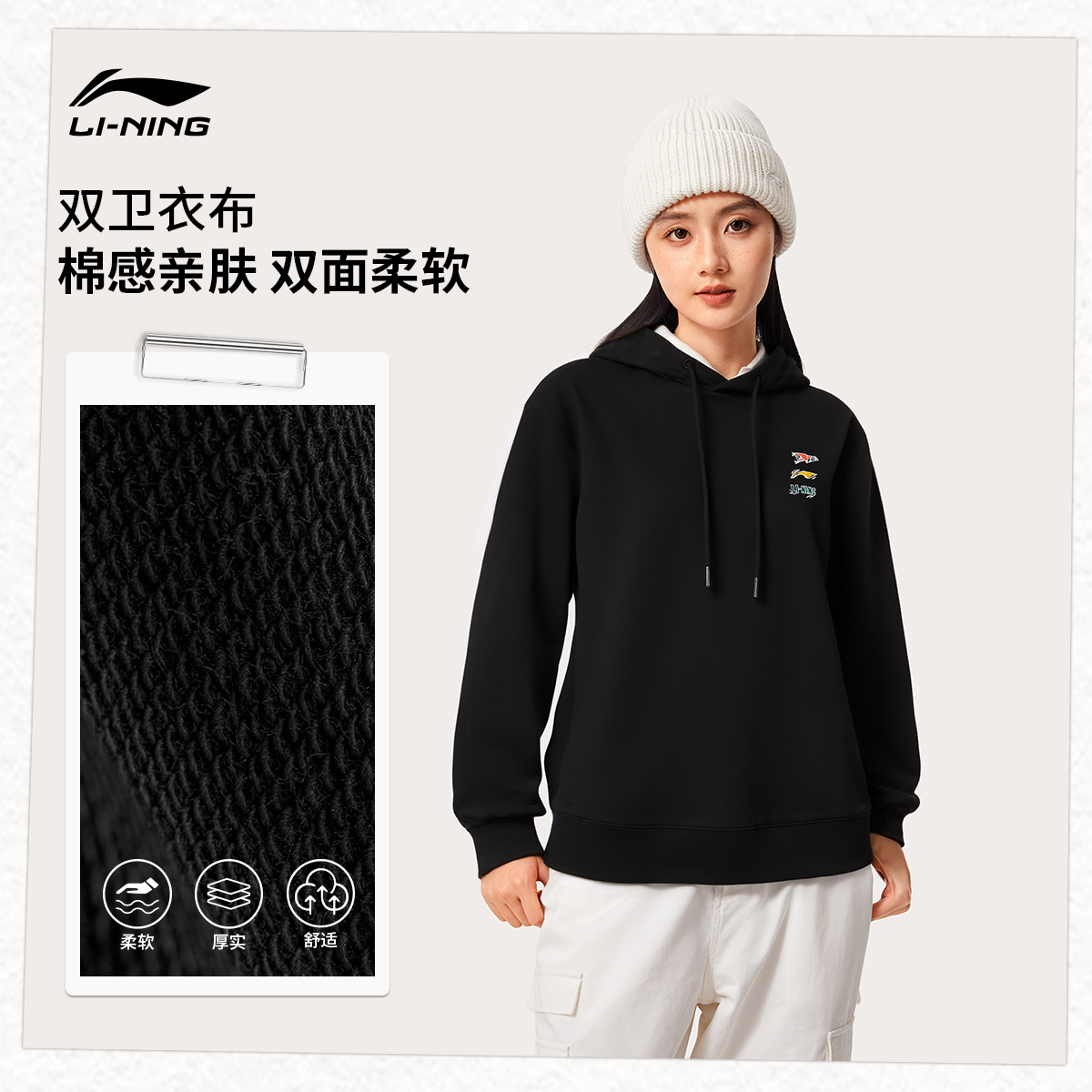 薄款 李宁卫衣男秋季 长袖 情侣连帽衫 黑色上衣针织运动服女 2025新款