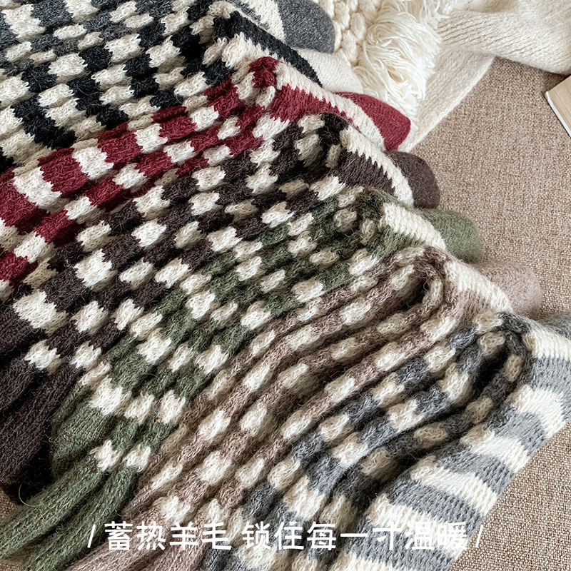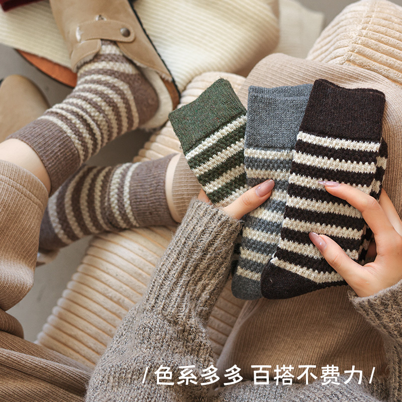 羊毛袜子女款 纯棉加厚保暖冬天长筒条纹堆堆袜 秋冬中筒袜配勃肯鞋