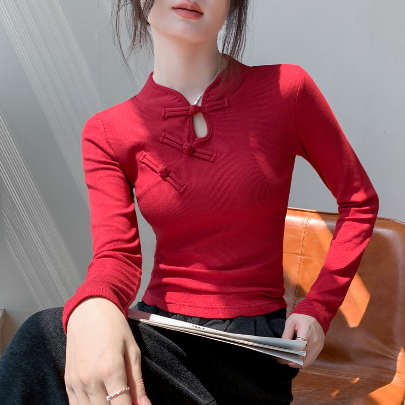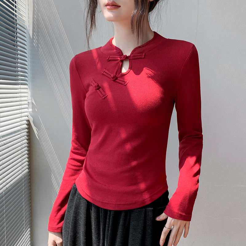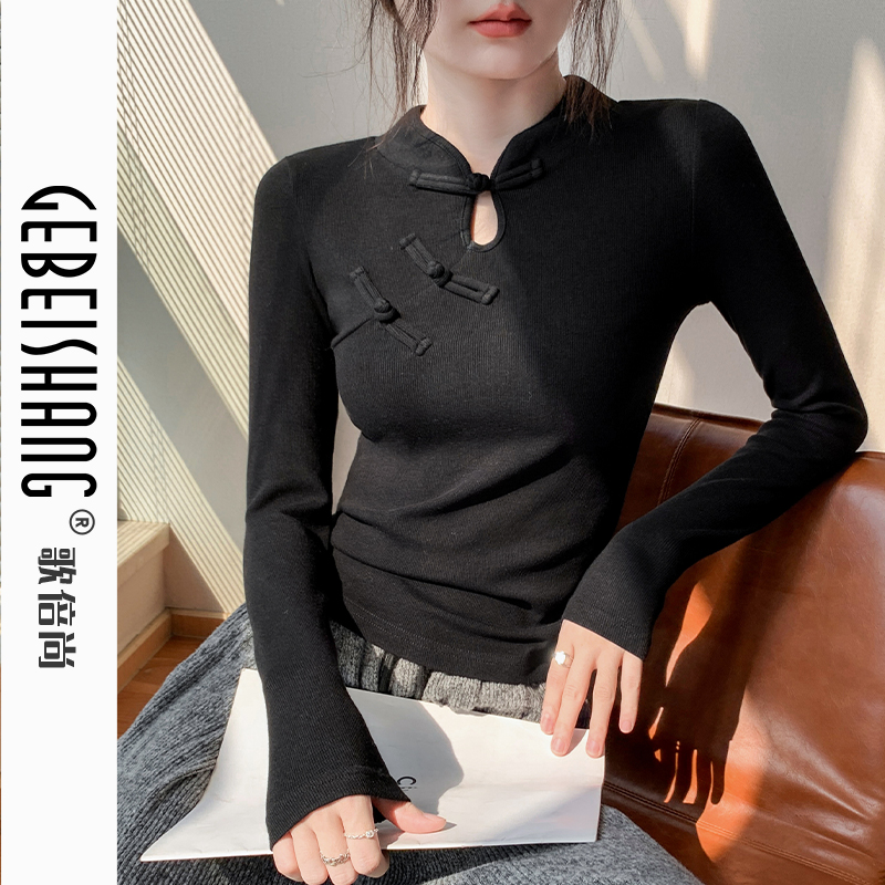 旗袍领长袖 纯色国风别致内搭打底衫 T恤女2024秋季 修身 新款 新中式