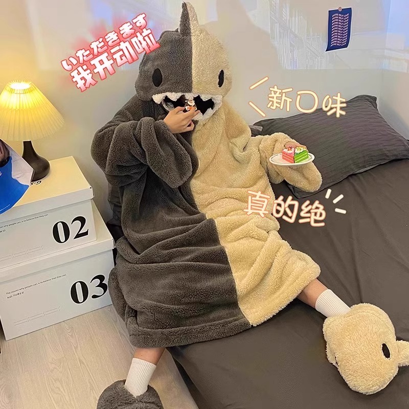 睡裙 加厚加大码 丑鱼睡衣女秋冬季 珊瑚绒情侣连体卡通搞怪睡袍男款