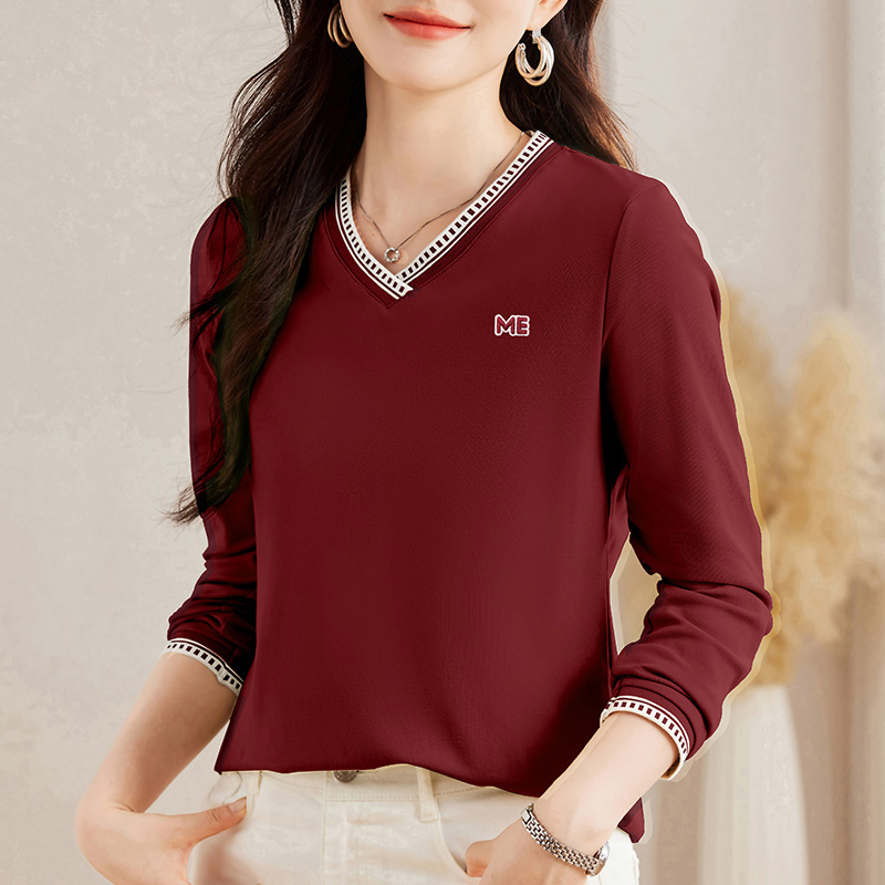 内搭打底衫 v领长袖 女装 早秋爆款 t恤女春秋安可拉红上衣2025年新款