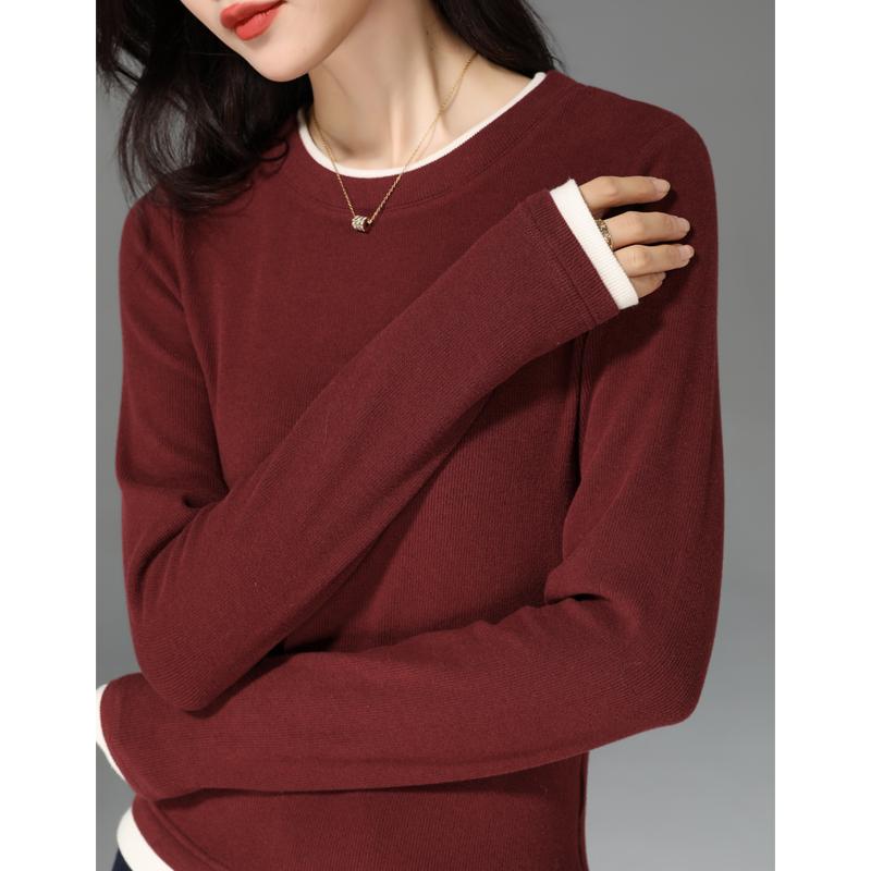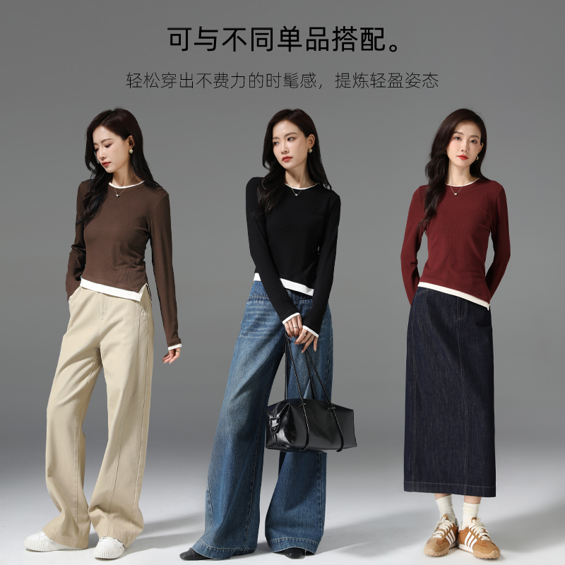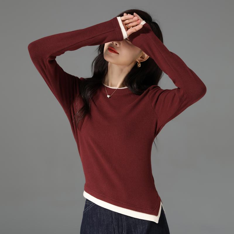 t恤圆领上衣修身 不规则设计感长袖 显瘦 女春秋新款 红色打底针织衫