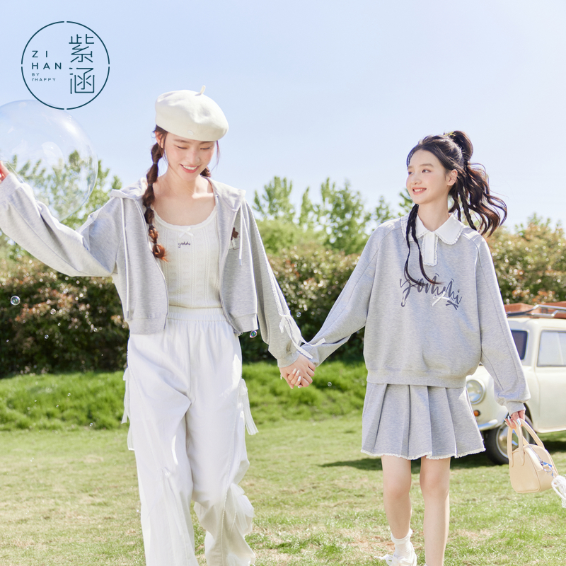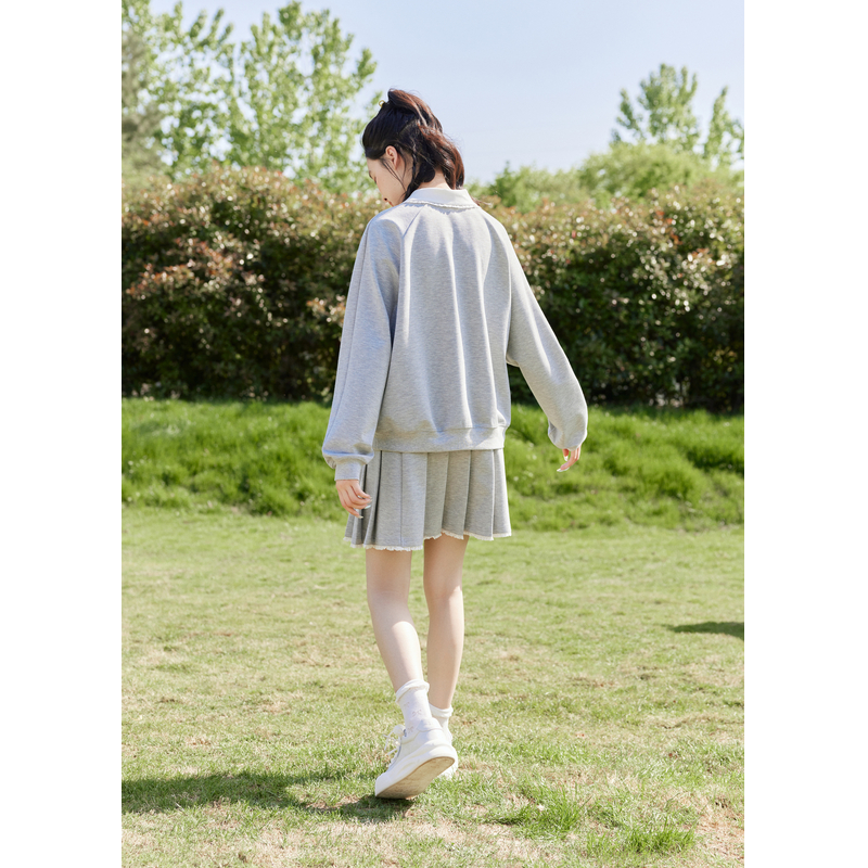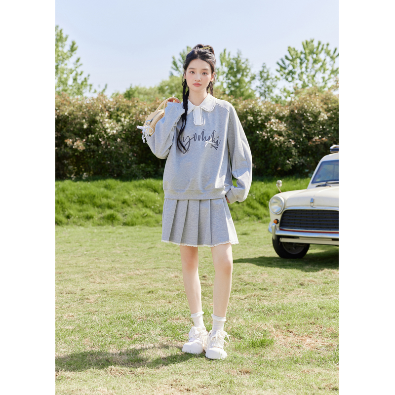 新款 紫涵甜美蕾丝花边polo领印花卫衣百褶短裙两件套装 女2025秋季
