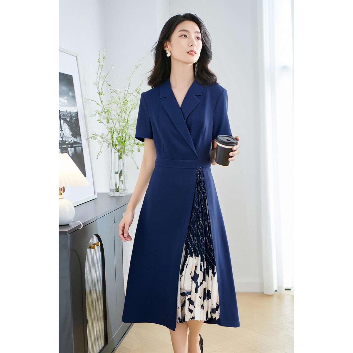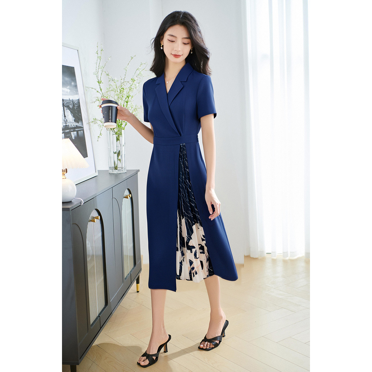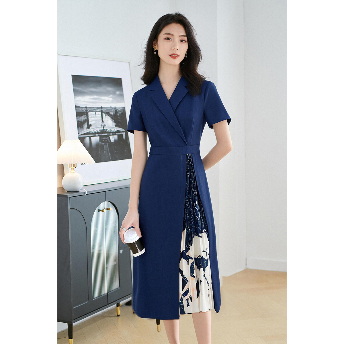 米思阳2025夏季 知性优雅气质连衣裙设计感印花拼接百褶裙子女 新款