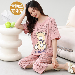 2025纯棉夏季 女士可外穿家居服套装 新款 七分裤 短袖 带胸垫睡衣女款