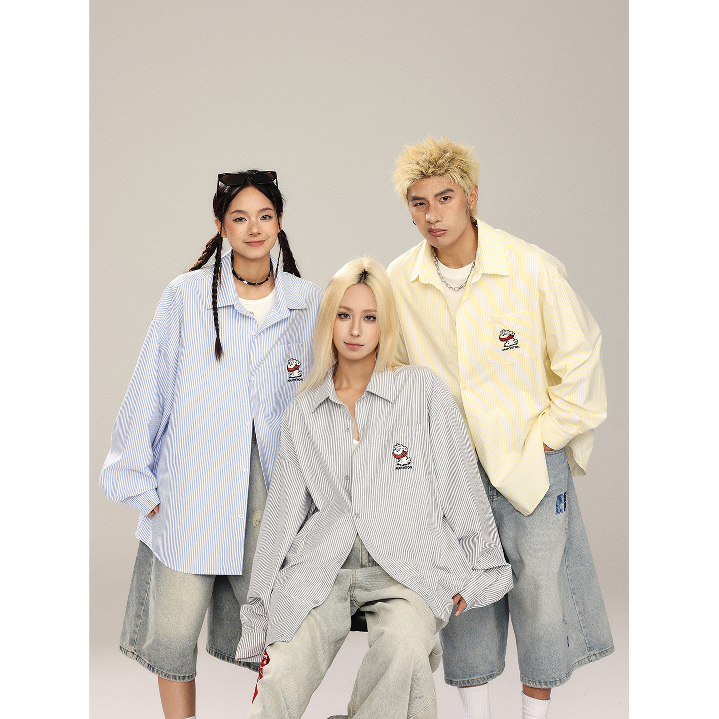 休闲宽松情侣百搭长袖 男春秋季 衬衣 高街刺绣条纹衬衫 MANYSTON美式