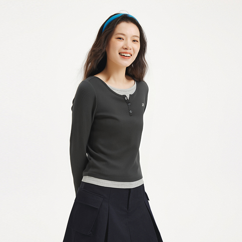 T恤随性优雅亨利领设计款 女士假两件长袖 上衣 新款 热风2025年秋季