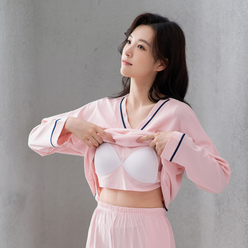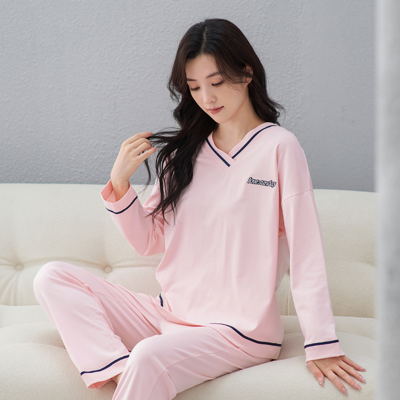 防凸点简约全棉家居服套装 芬腾带胸垫睡衣女秋季 长裤 纯棉长袖 新品