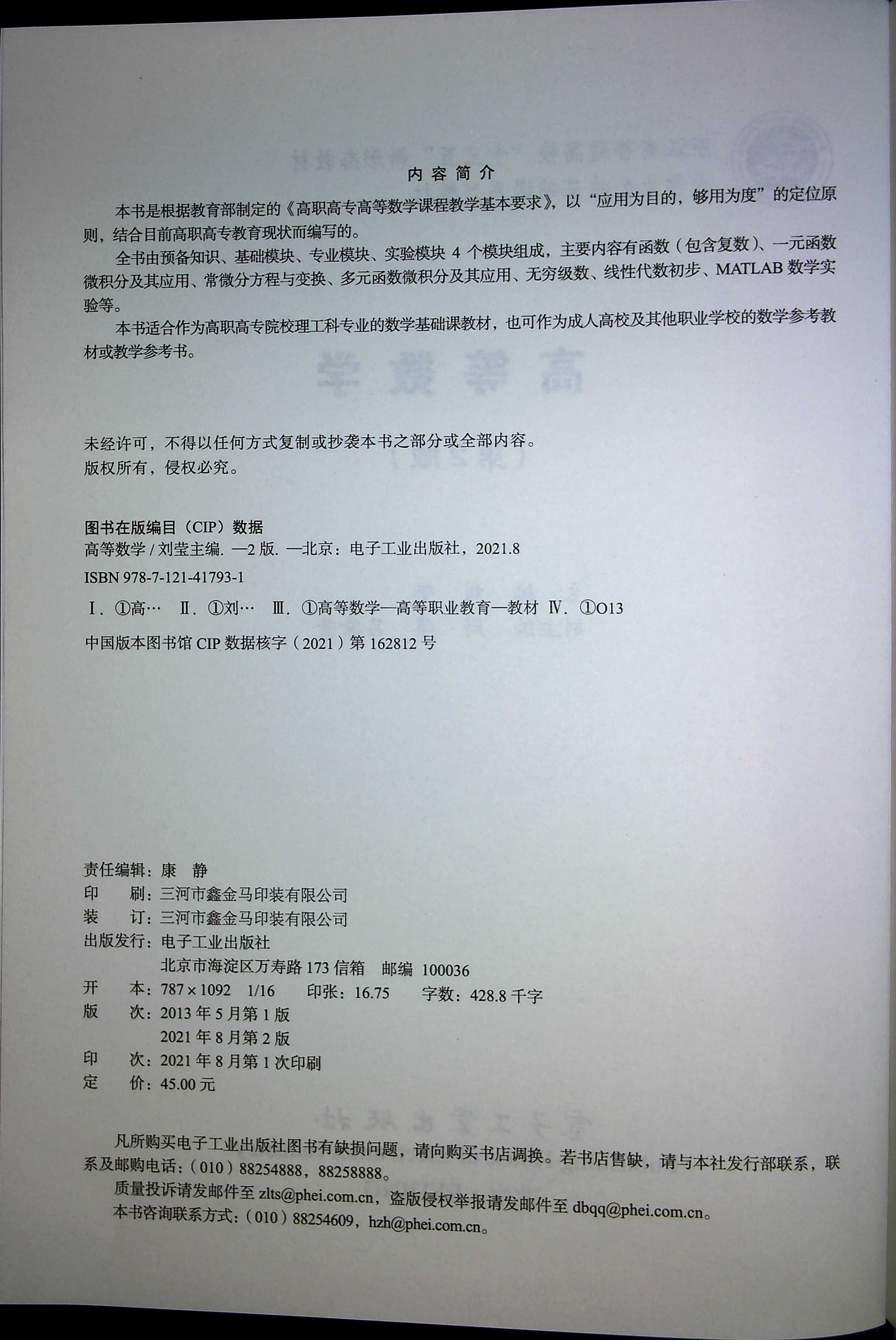 高等数学 电子工业出版 第2版 高等院校高职高专院校理工科专业数学基础课教材书 社 刘莹 官方旗舰店