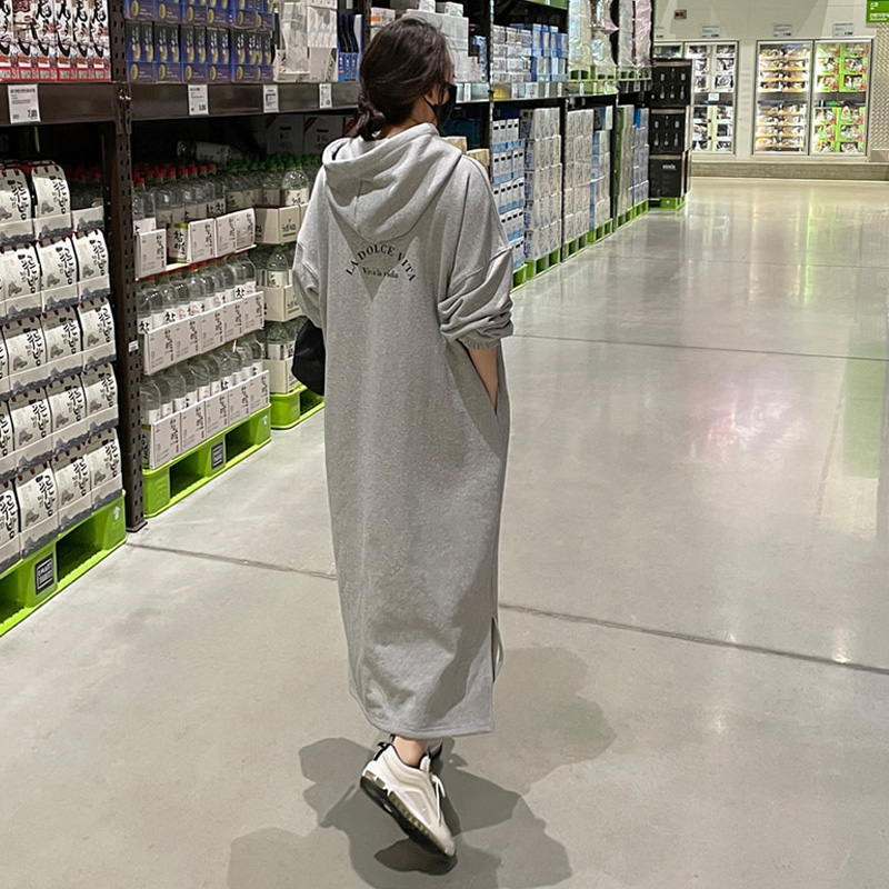 宽松显瘦中长款 卫衣女韩版 过膝开叉加厚连衣裙 连帽套头长款 春秋款