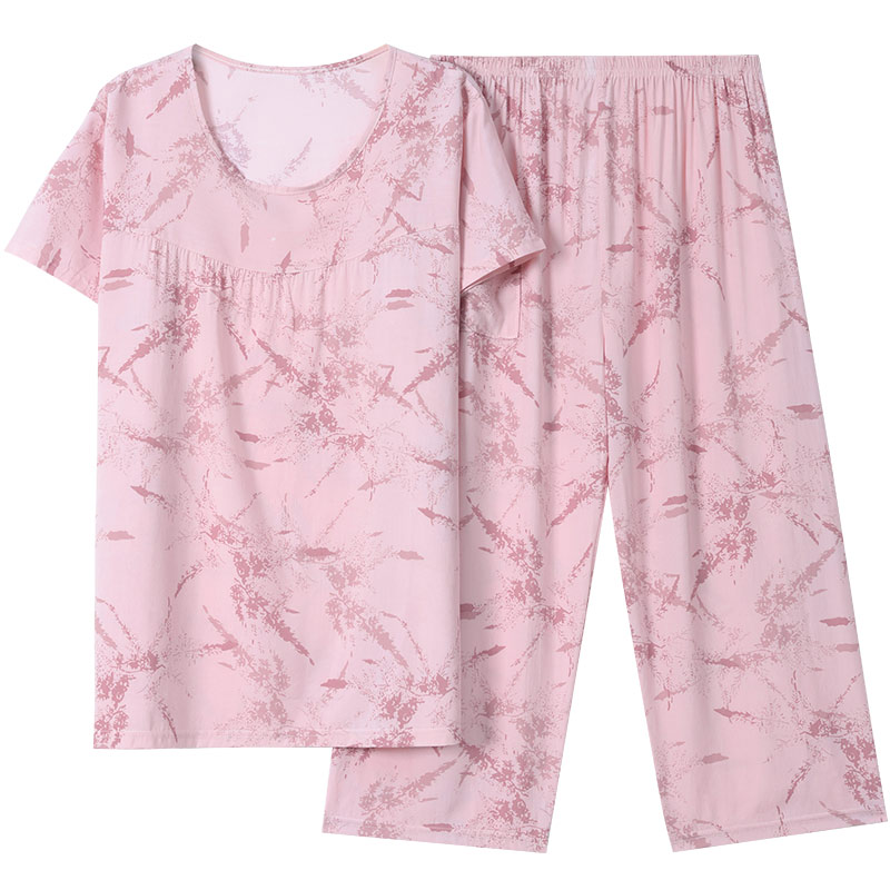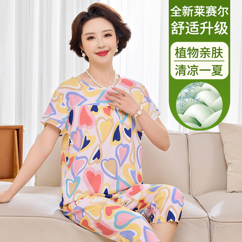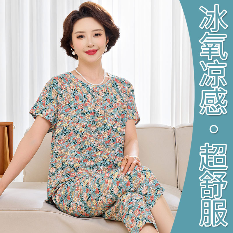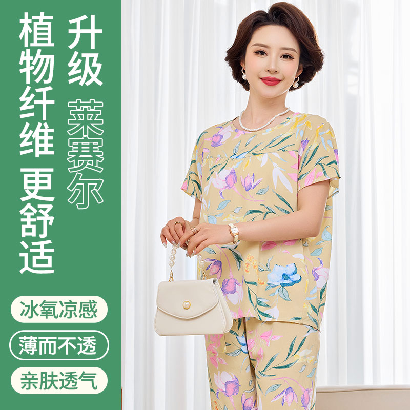 棉绸睡衣女款 大码 夏凉感妈妈短袖 中老年薄款 高级感 套装 莱赛尔夏季