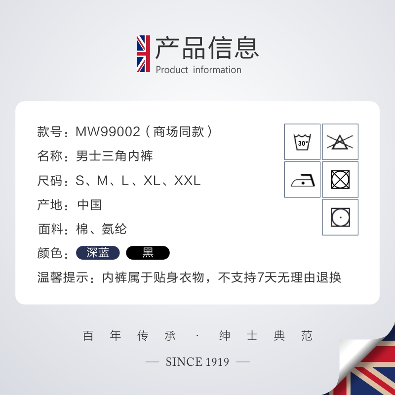 抗菌透气亲肤弹性舒适MW99002 棉氨纶三角裤 BYFORD 百富男士