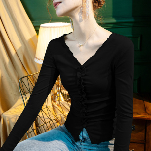 洋气长袖 2025秋季 纯色春秋新款 女修身 气质T恤 V领荷叶边螺纹打底衫