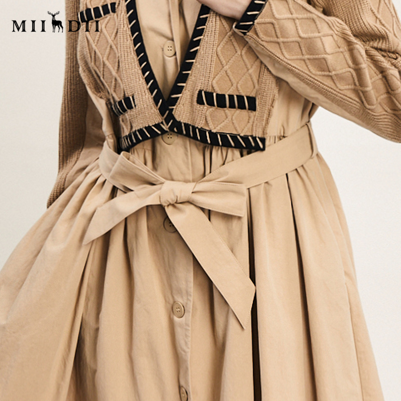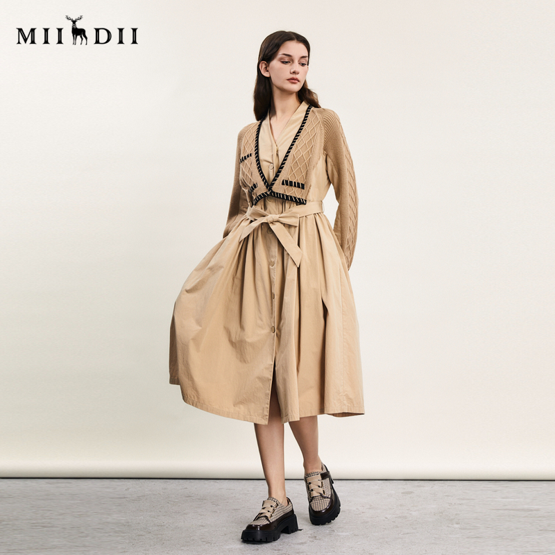 谜底毛织拼接连衣裙长袖 复古气质长裙大摆裙241ML0129 春新款