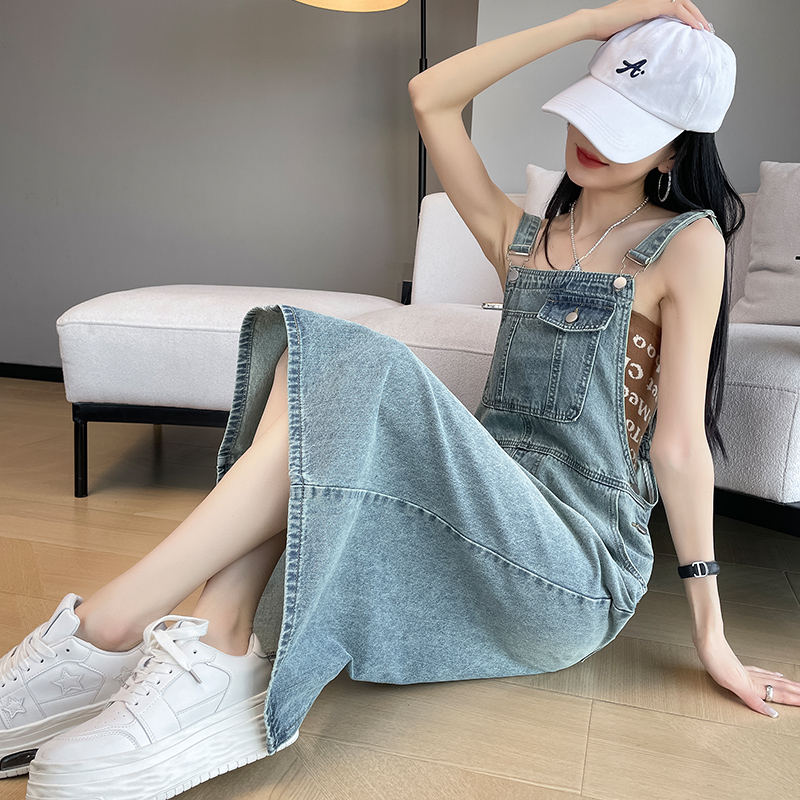 减龄牛仔背带裙女春秋夏季 宽松显瘦复古开叉盐系连衣裙 高腰中长款