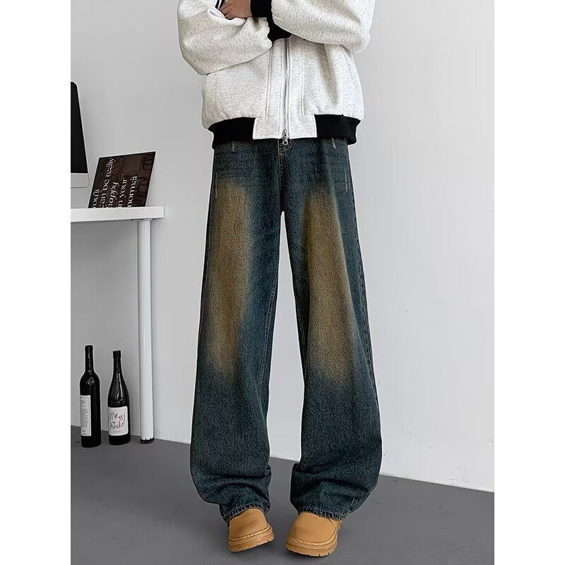 新品 25秋季 重磅竹节纹做旧水洗丹宁宽松猫须直筒牛仔裤 GXG男装