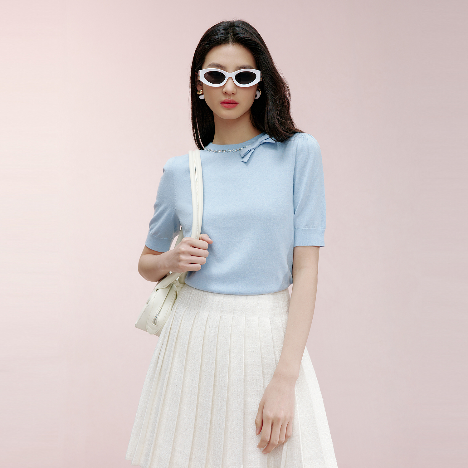 饰半袖 朗姿集团LIME莱茵圆领针织短袖 T恤春羊毛混纺珠链蝴蝶结装