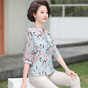 女装 洋气质2025新款 短袖 两件套装 中年妈妈夏装 中老年小衫 上衣衬衫