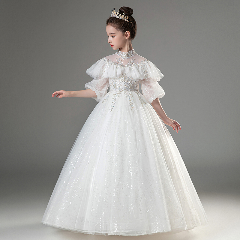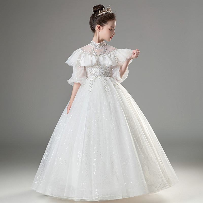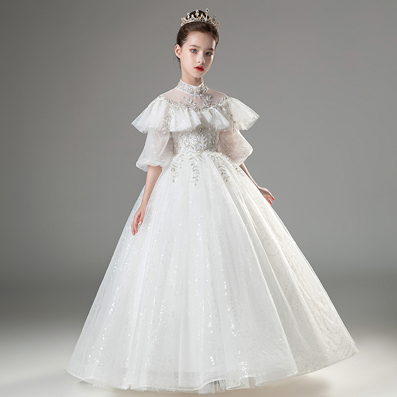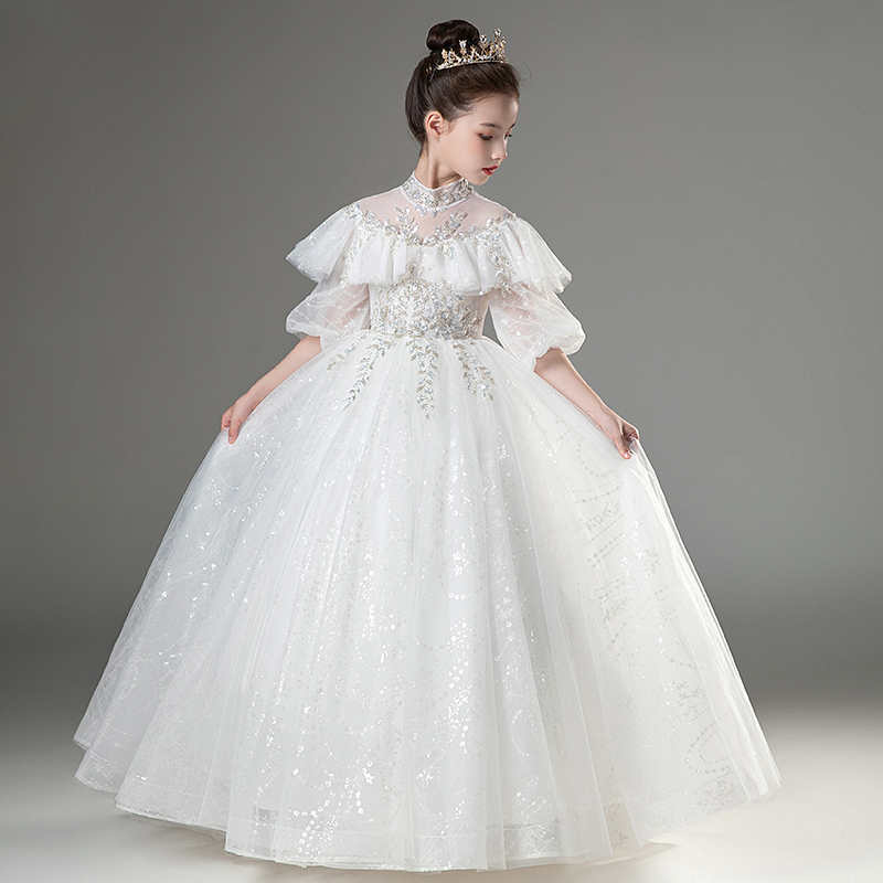 儿童礼服公主裙生日小女孩主持人花童婚纱秋冬白色女童钢琴演出服