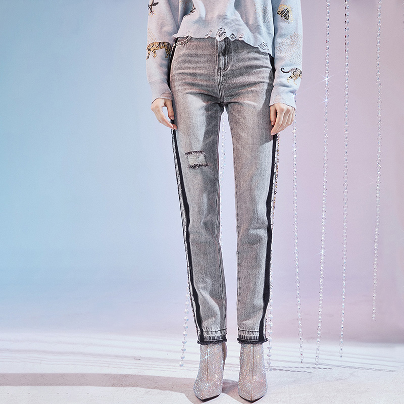 712044500 丹宁刺绣毛边破洞直筒牛仔裤 裂帛outlets年春秋新款 个性