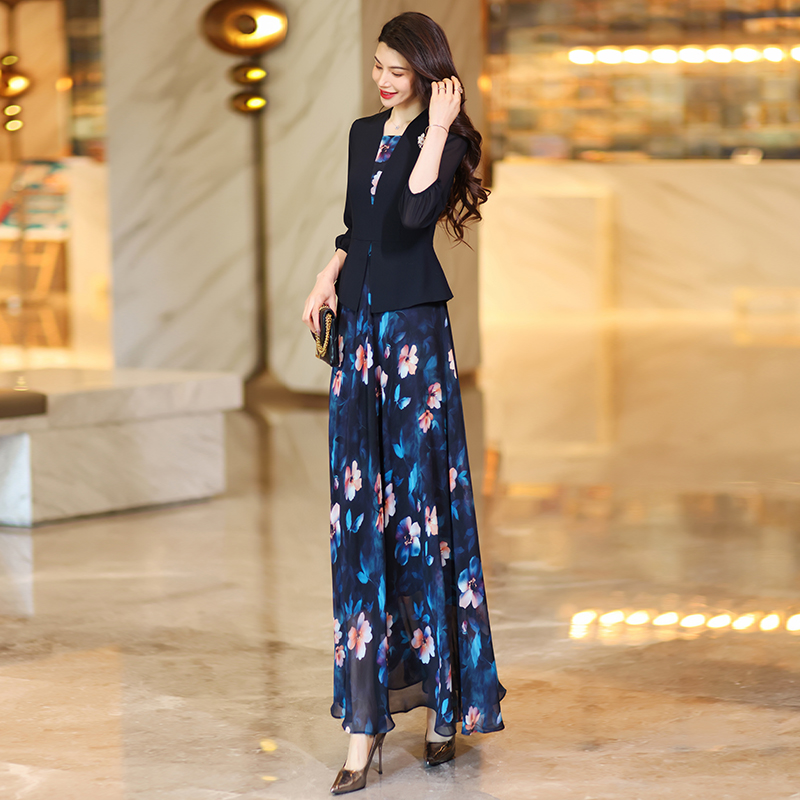 藏蓝色轻奢连衣裙女夏季 设计感气质显瘦雪纺假两件超长裙029 新款