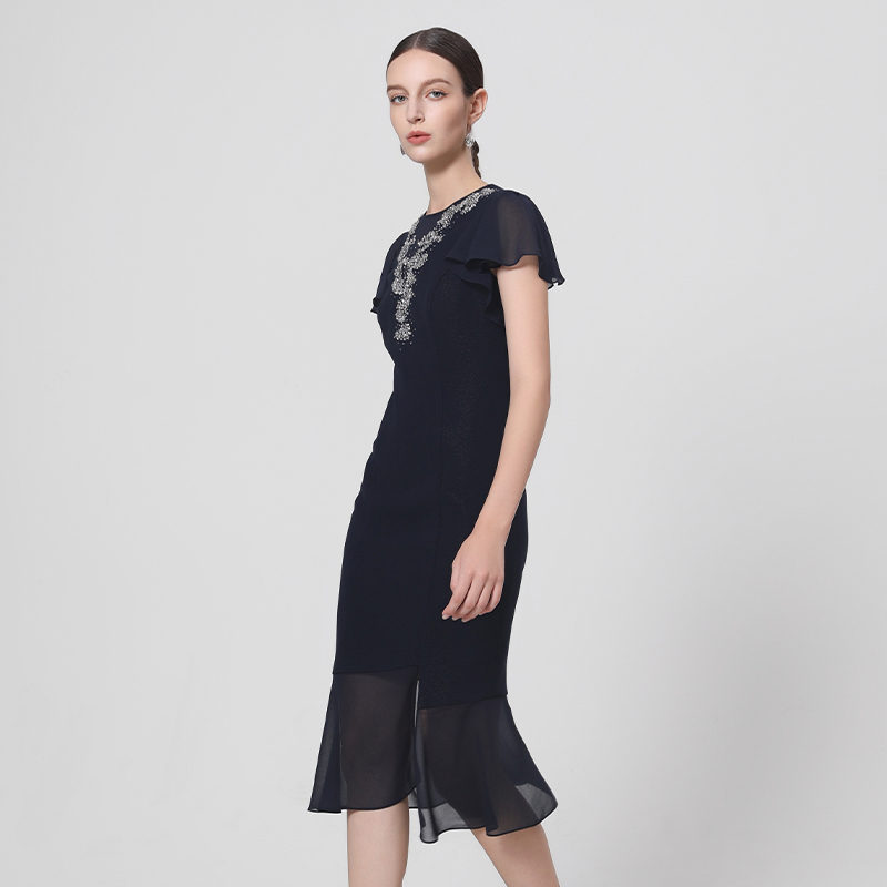 钉珠礼裙女官方正品 阿丹娜2025春夏新款 蓝色醋纤混纺连衣裙子修身