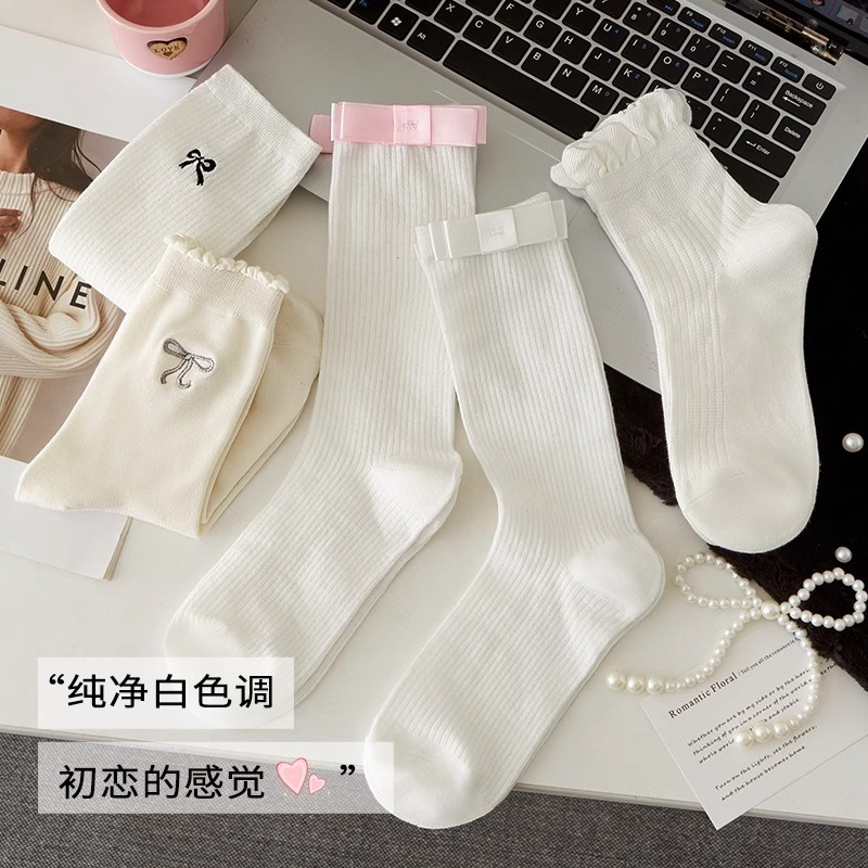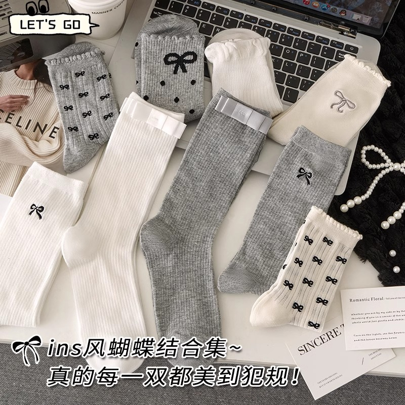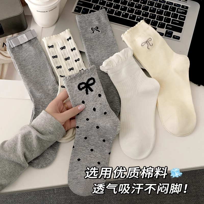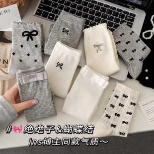 波点花边袜子女春夏季 中筒袜ins潮百搭棉袜蝴蝶结长筒堆堆袜 薄款