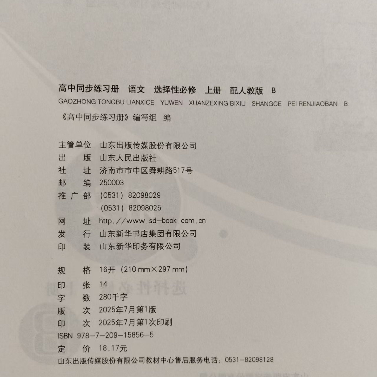 B层 社高二语文选修上同步练习册配人教版 2025秋B层配人教版 高中同步练习册语文选择性必修上册山东人民出版