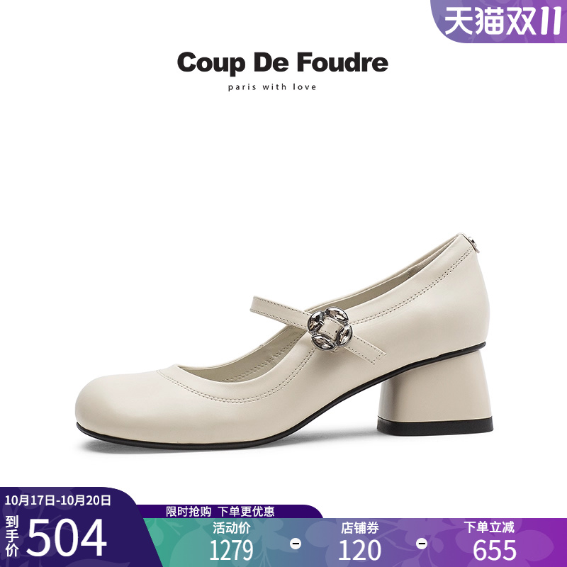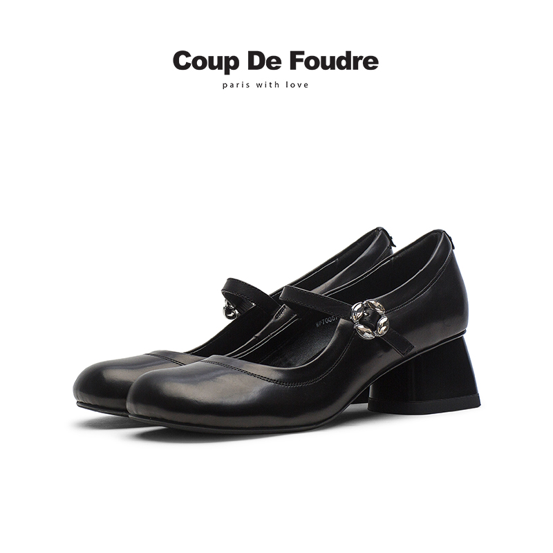 轻奢秋季 真皮圆头一字扣带单鞋 新款 复古粗跟玛丽珍鞋 法式 CDF女鞋