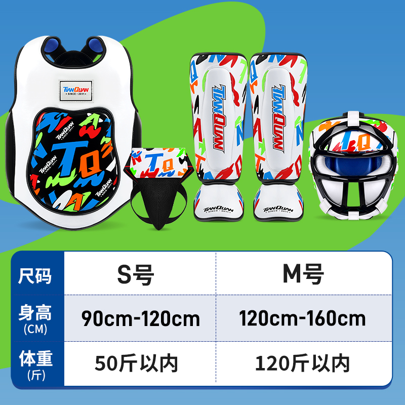 天拳儿童搏击护具全套拳击头盔护头面罩散打护腿泰拳护裆少儿护胸