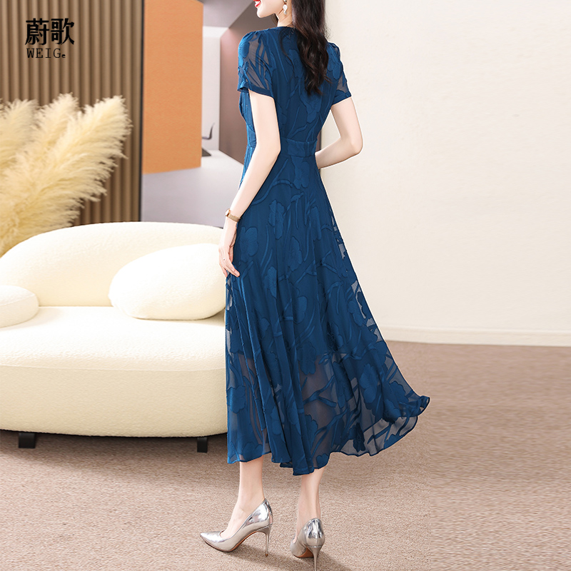 优雅显瘦大摆长裙 新款 今年流行蓝色高级感提花连衣裙长款 2025夏季