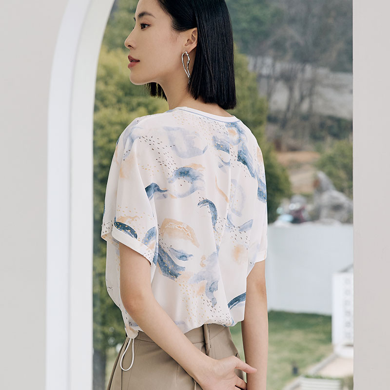 下摆抽绳设计感圆领短袖 新款 T恤上衣 女夏季 玳莎海风印花真丝小衫