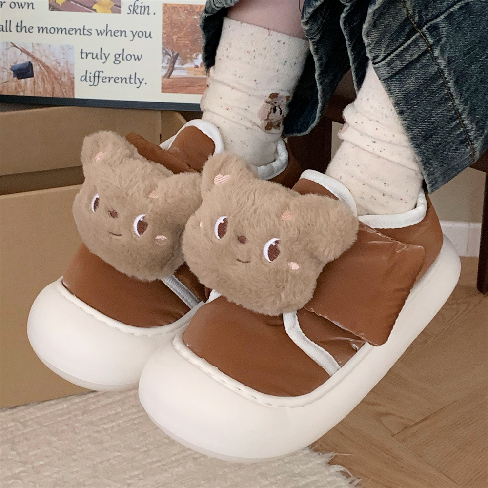 毛绒小熊魔术贴外穿防滑加绒板鞋 女冬季 百搭圆头面包棉鞋 网红时尚