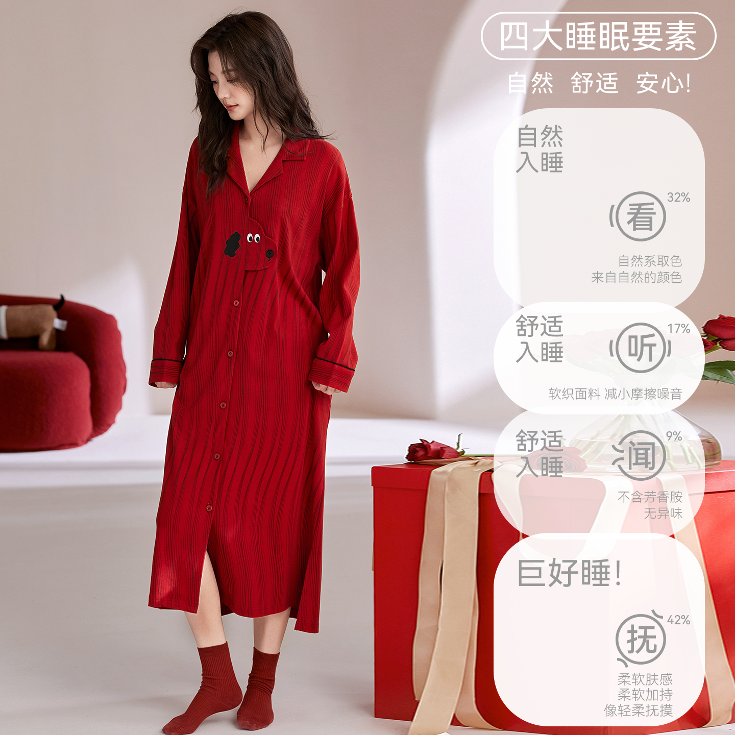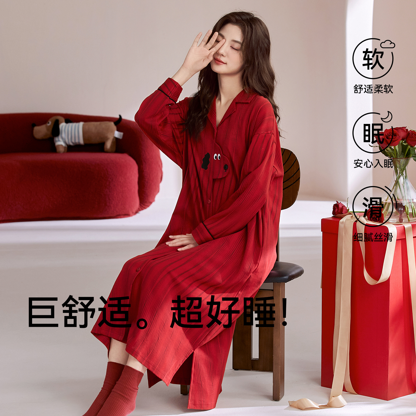 可外穿长袖 南极人大红色睡裙女春秋纯棉长裙加大码 本命年2025新款
