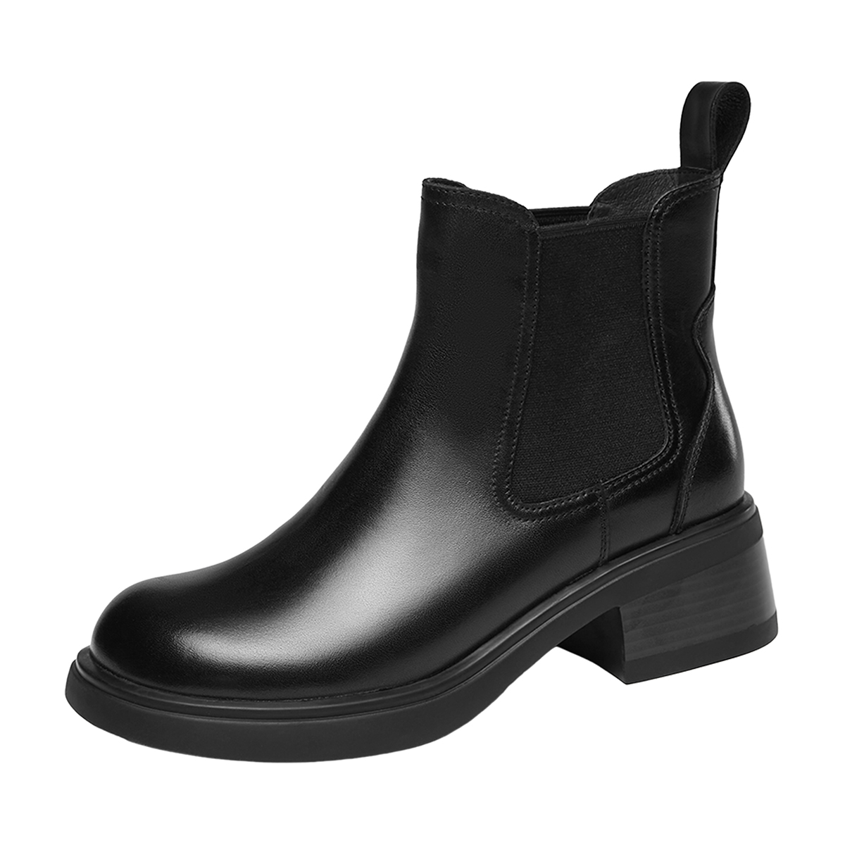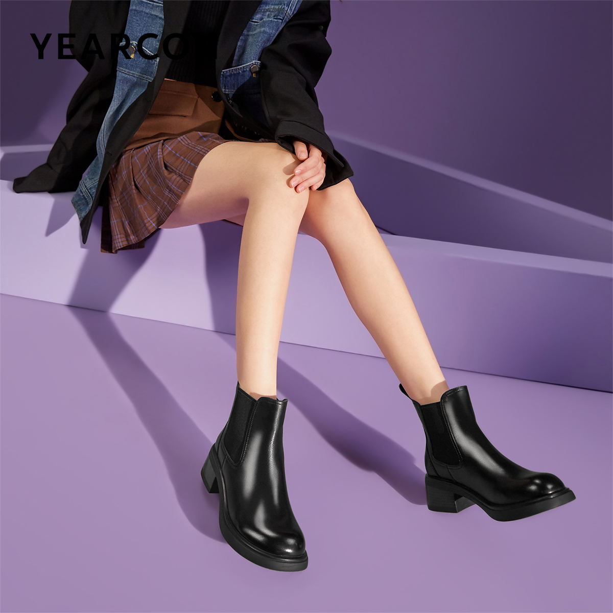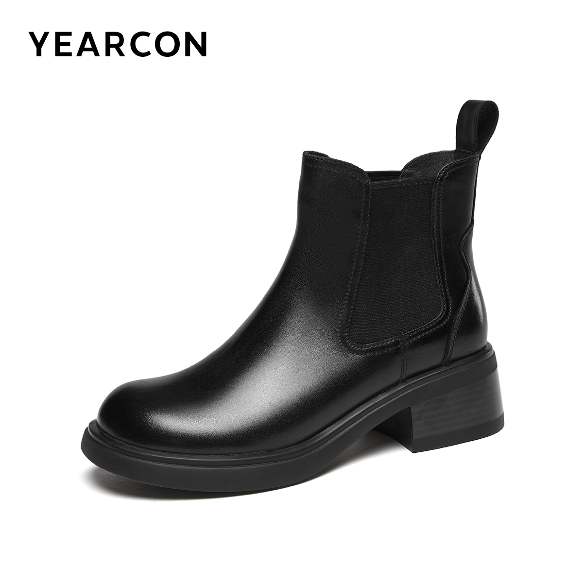 意尔康女鞋 休闲加绒短靴切尔西靴粗跟气质英伦显瘦复古及踝靴 冬季