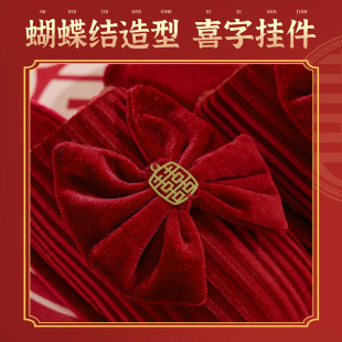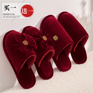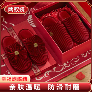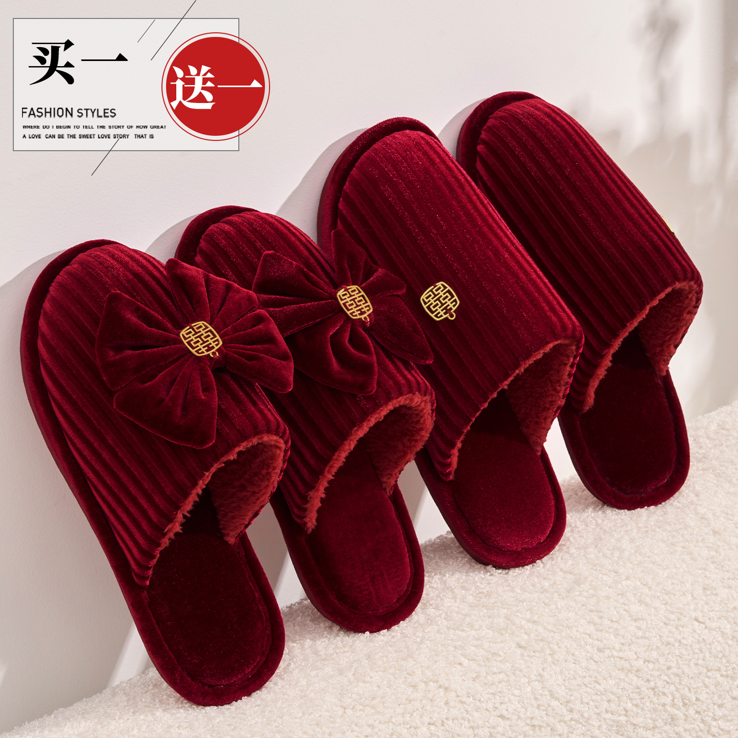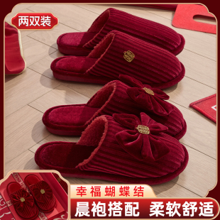 高级新婚礼新娘陪嫁喜庆轻奢晨袍情侣婚鞋 红色拖鞋 结婚一对秋冬季