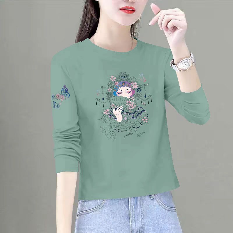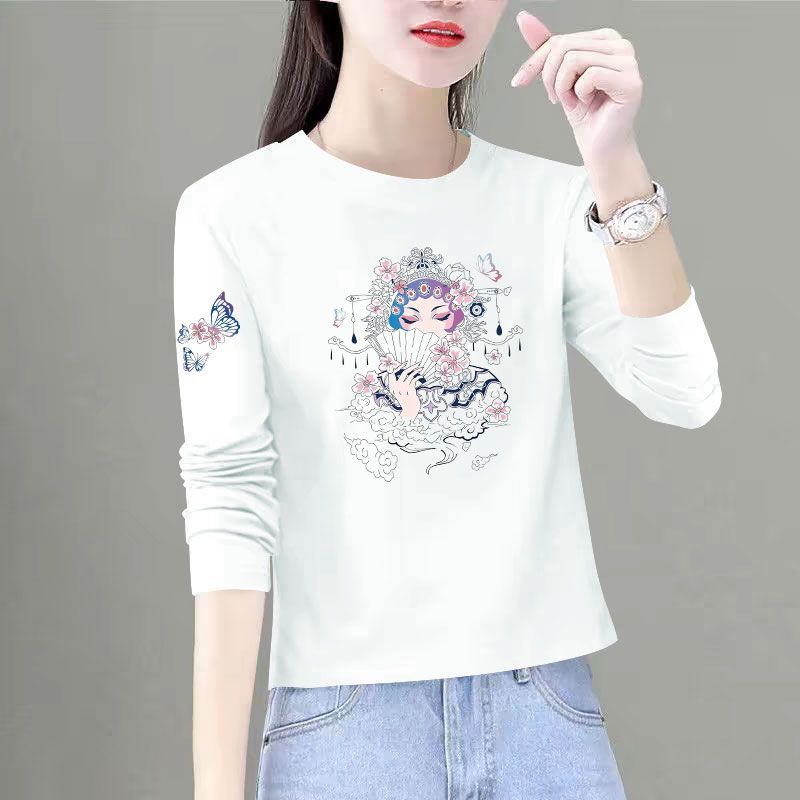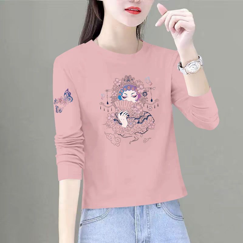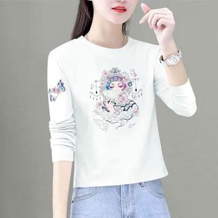洋气韩版 100%纯棉长袖 时尚 T恤女春秋新款 宽松遮肉ins上衣 印花短款
