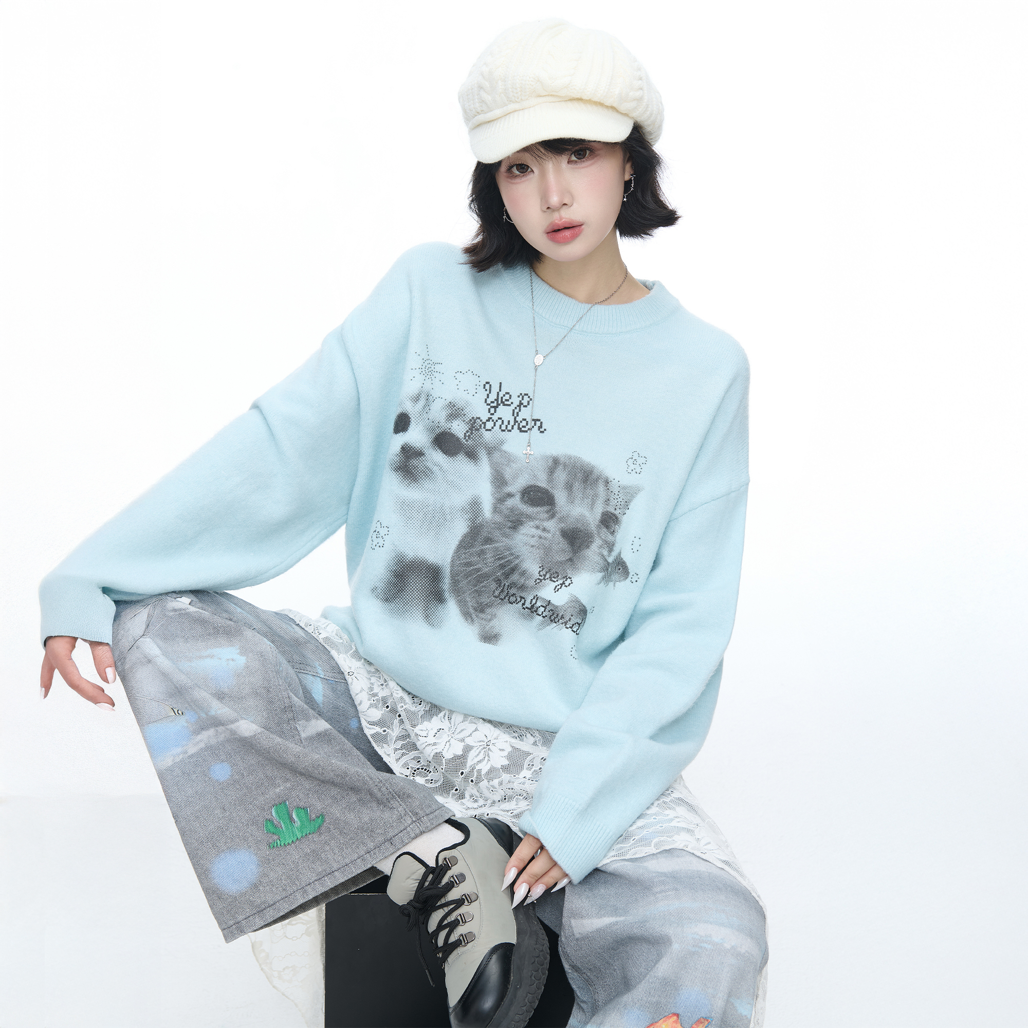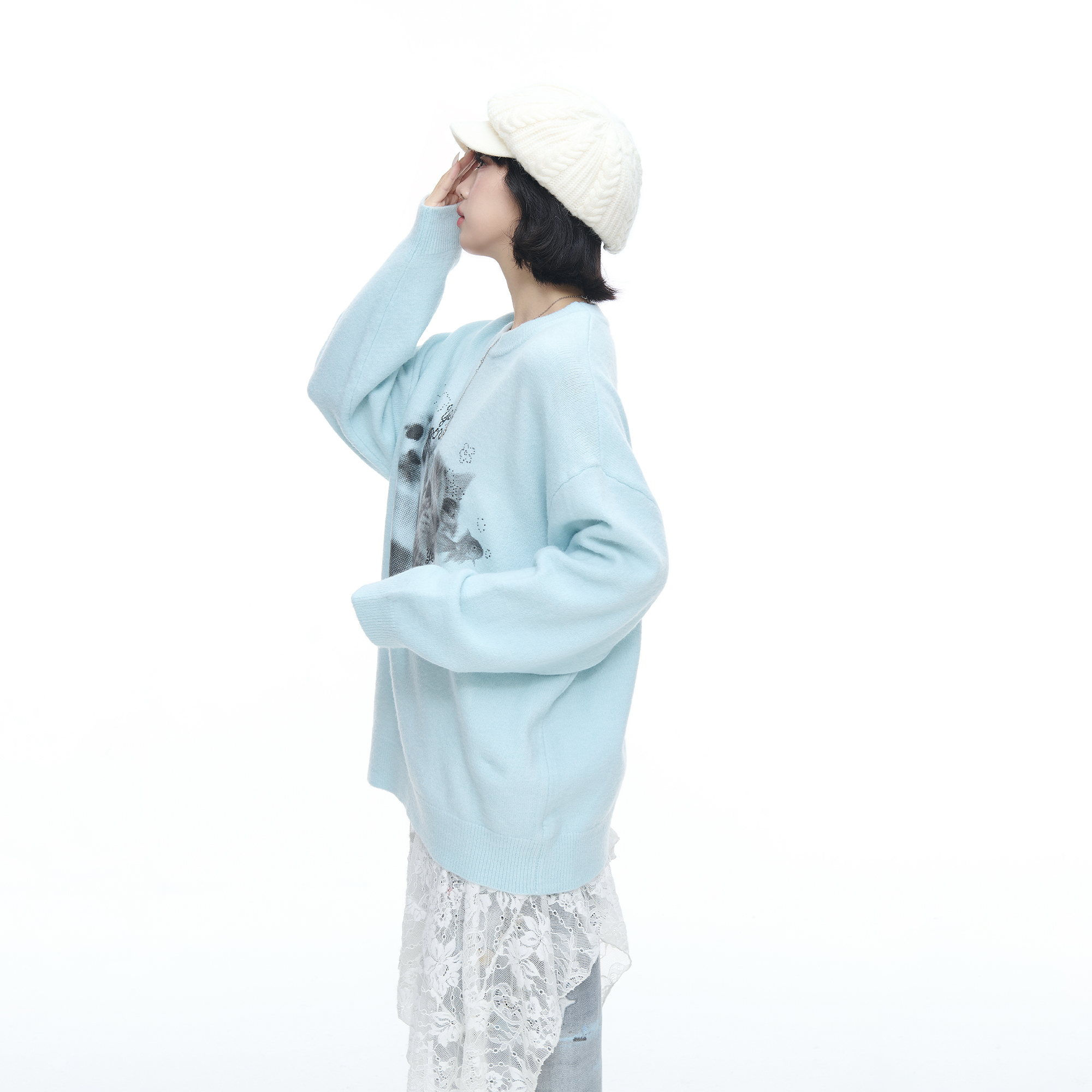 三福毛衣秋冬慵懒高级感2025新款 510472 蘑菇图案V领宽松上衣女装