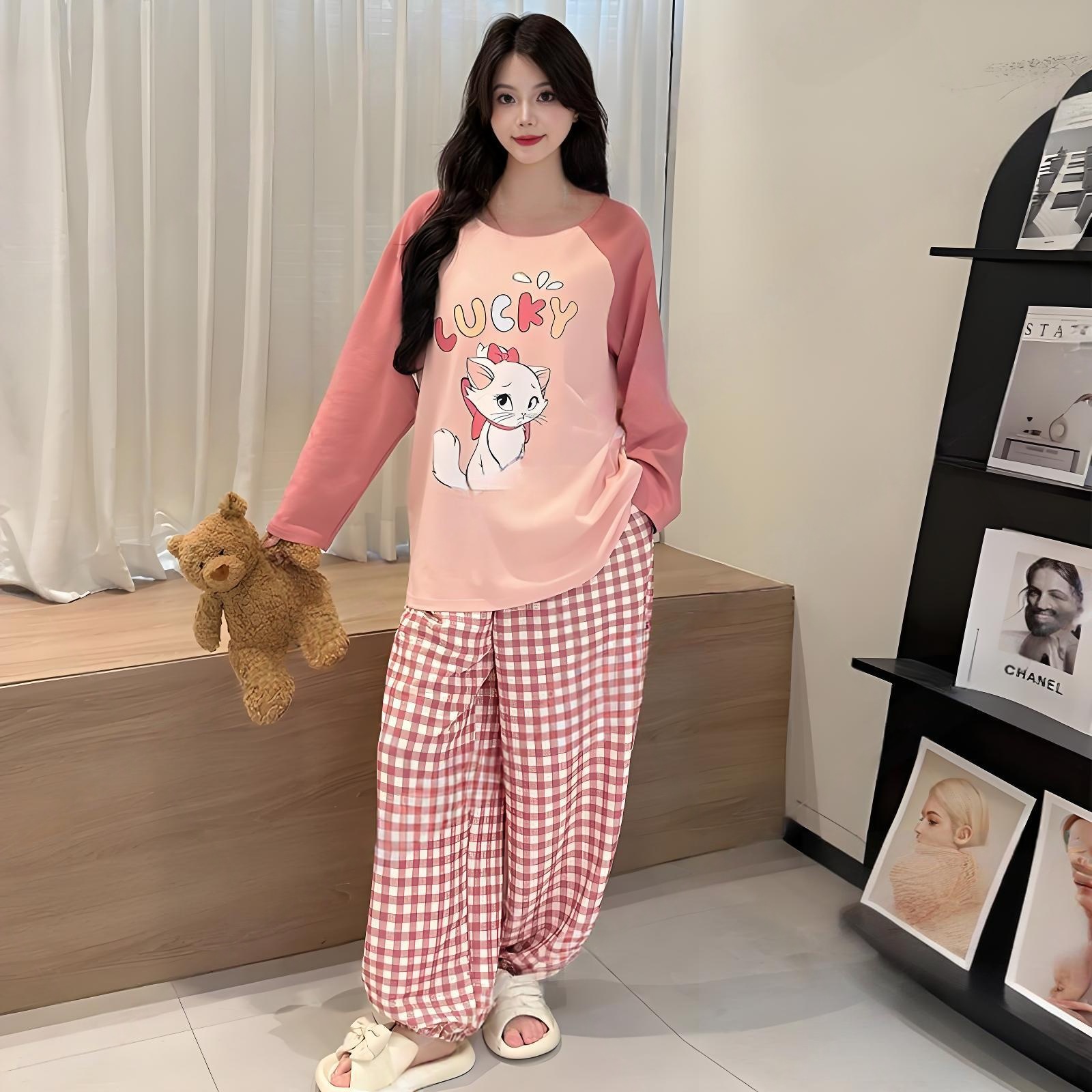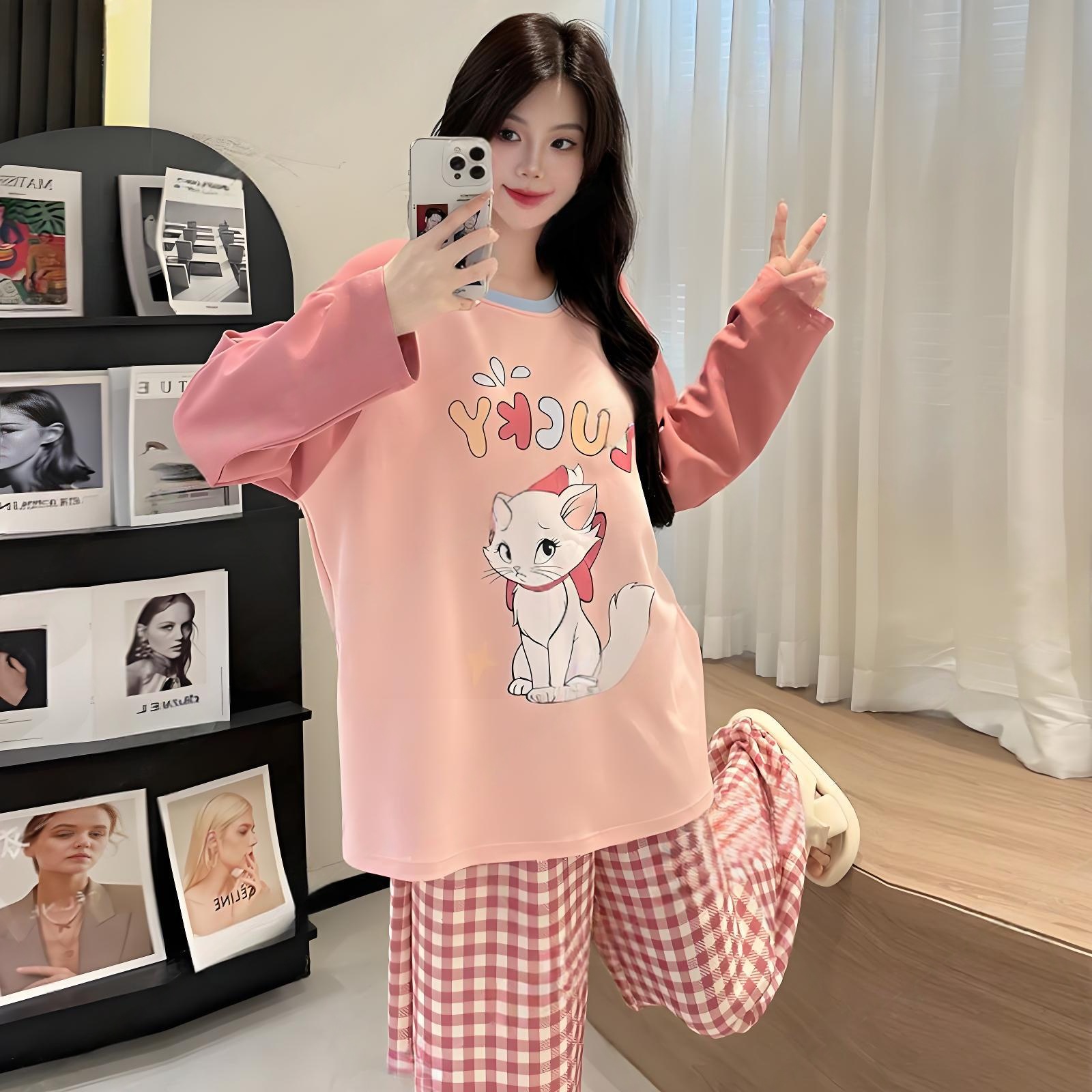 大码 带胸垫棉绸睡衣女款 甜美风卡通小猫长袖 春秋季 家居服 2025新款