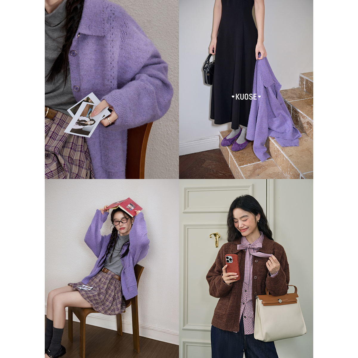 蓝色翻领毛衣 新款 阔色慵懒风灰色针织开衫 外套上衣女2025秋冬季