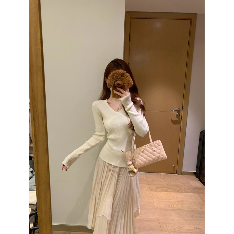 修身 女春秋2025新款 收腰内搭毛衣针织上衣 打底衫 白色正肩v领长袖
