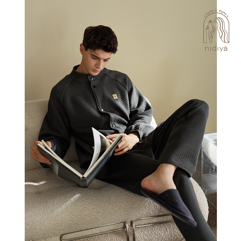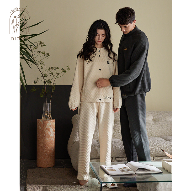 秋冬家居服套装 妮狄娅睡衣女秋季 纯棉夹层加厚保暖立领男休闲开衫