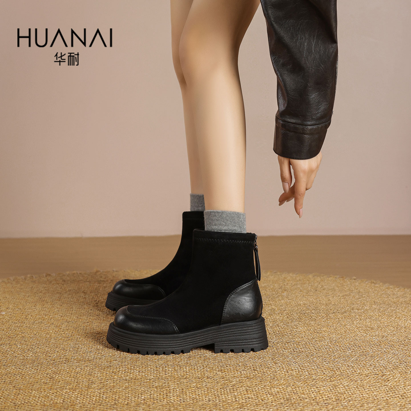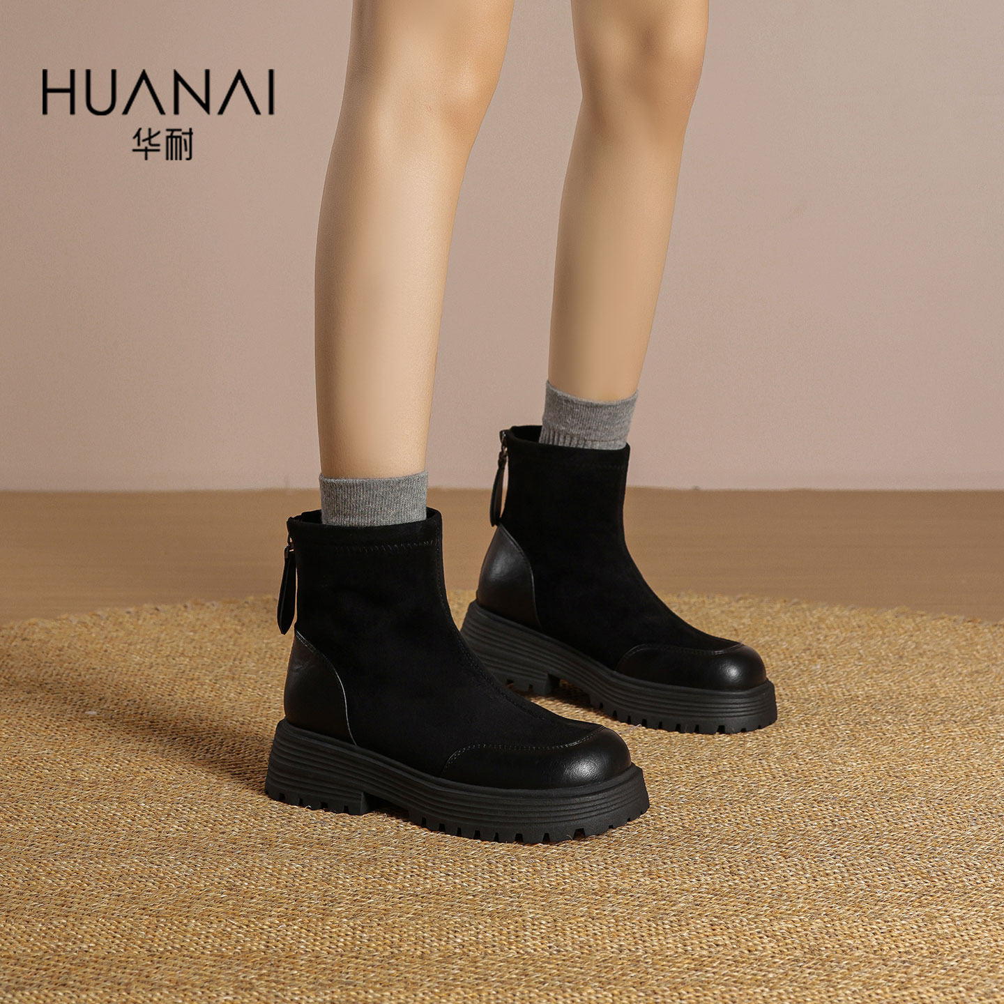 华耐厚底短靴女2025秋冬新款 圆头粗跟弹力靴百搭马丁靴增高瘦瘦靴