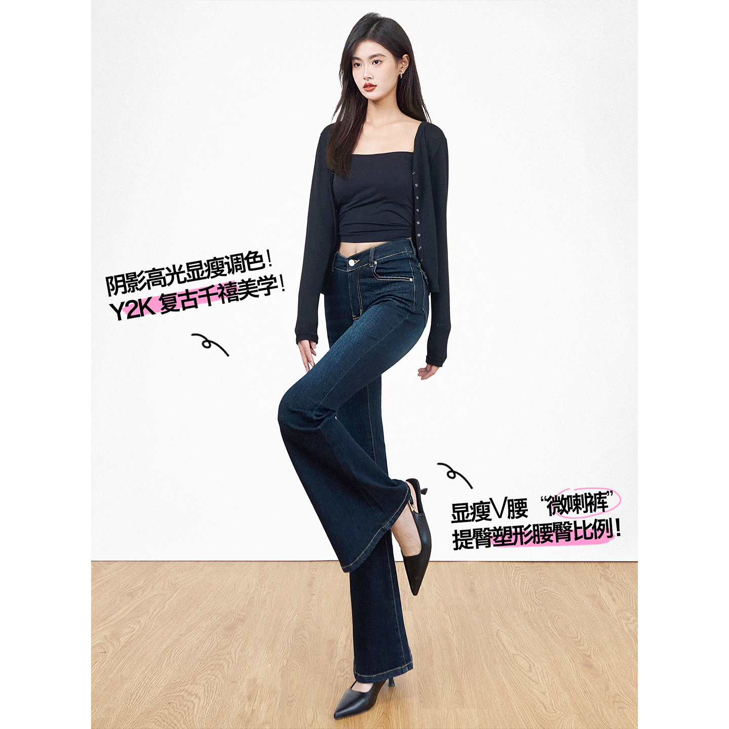 弹力喇叭裤 女辣妹V腰2025秋季 复古微喇牛仔裤 SJOGV型腰线深蓝修身