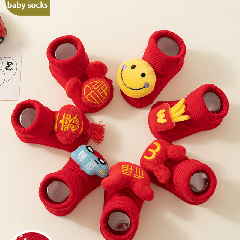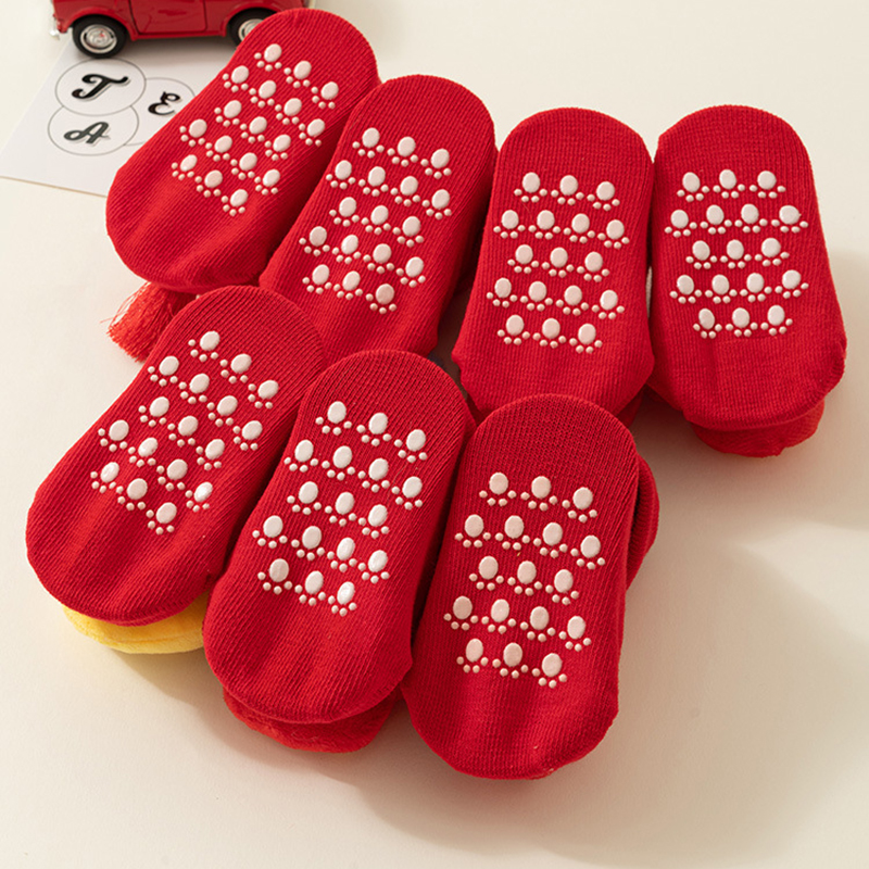 新生婴幼儿春秋新品 红色点胶防滑宝宝百天满月松口卡通地板袜子